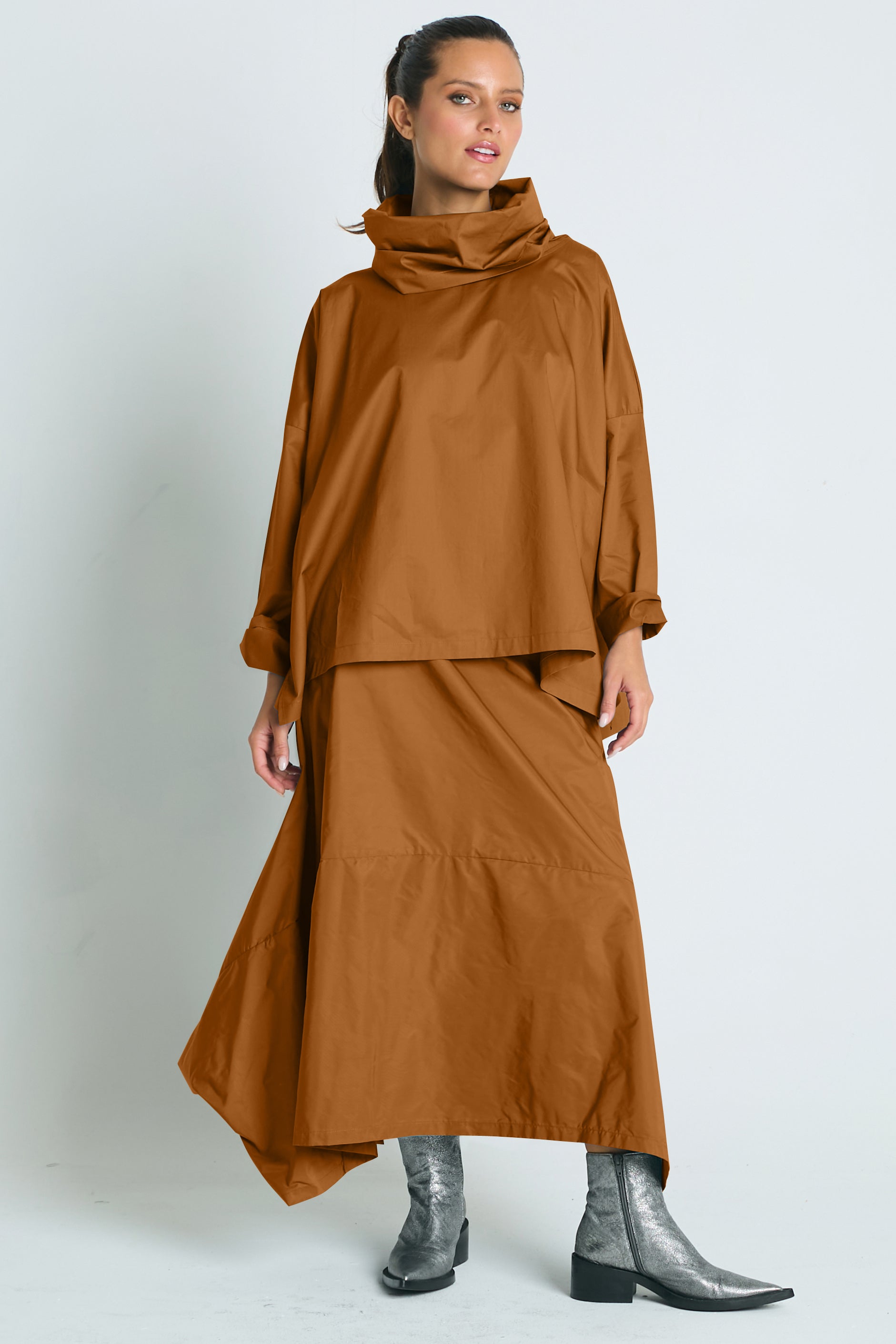 This artfully draped cowl top brings architectural ease to everyday style. Made from crisp cotton with a soft touch, it¡¯s lightweight and breathable¡ªstructured yet unrestrictive. The relaxed silhouette is elevated by its sculptural neckline and wide sleeves that roll with intention.