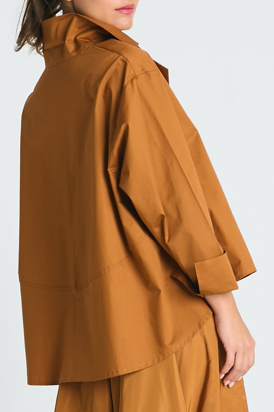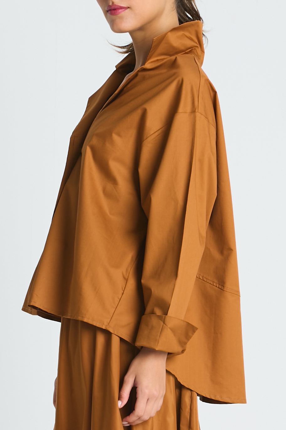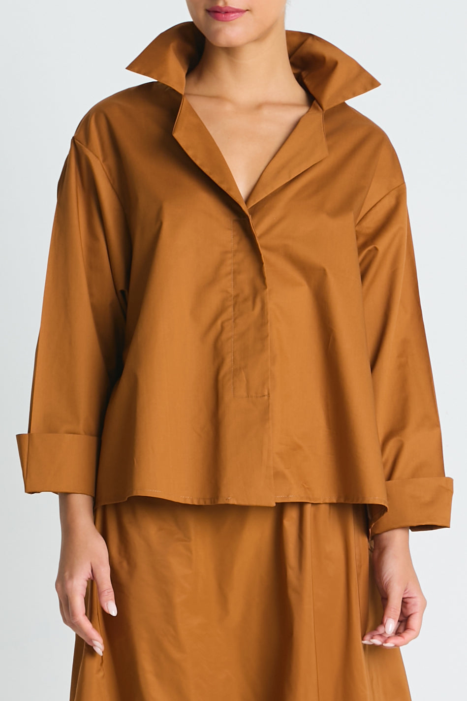 An effortless take on a classic, this crisp cotton poplin top brings structure with a relaxed edge. The wide collar and subtle placket create a polished yet easy-going feel, while the cropped, A-line silhouette drapes beautifully for a modern, flattering fit. Rolled sleeves add a casual touch, making this the perfect layer for styling up or down.