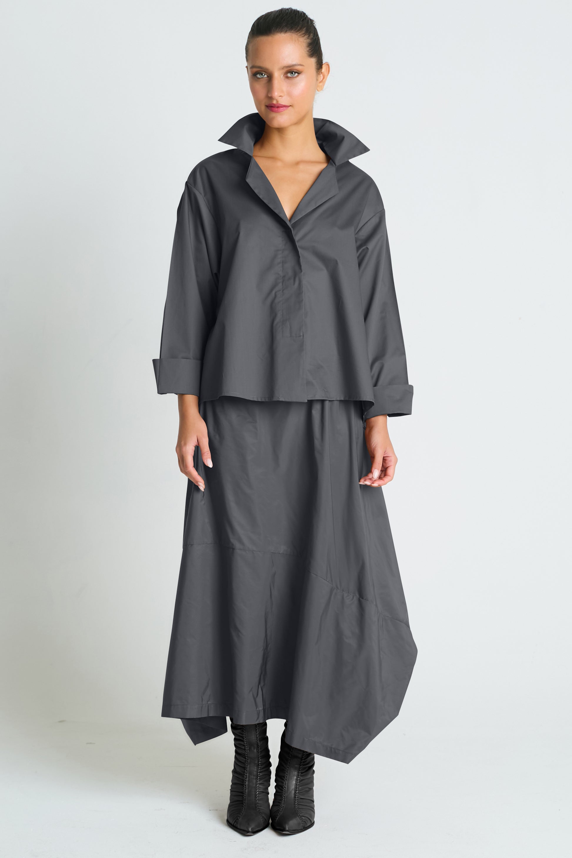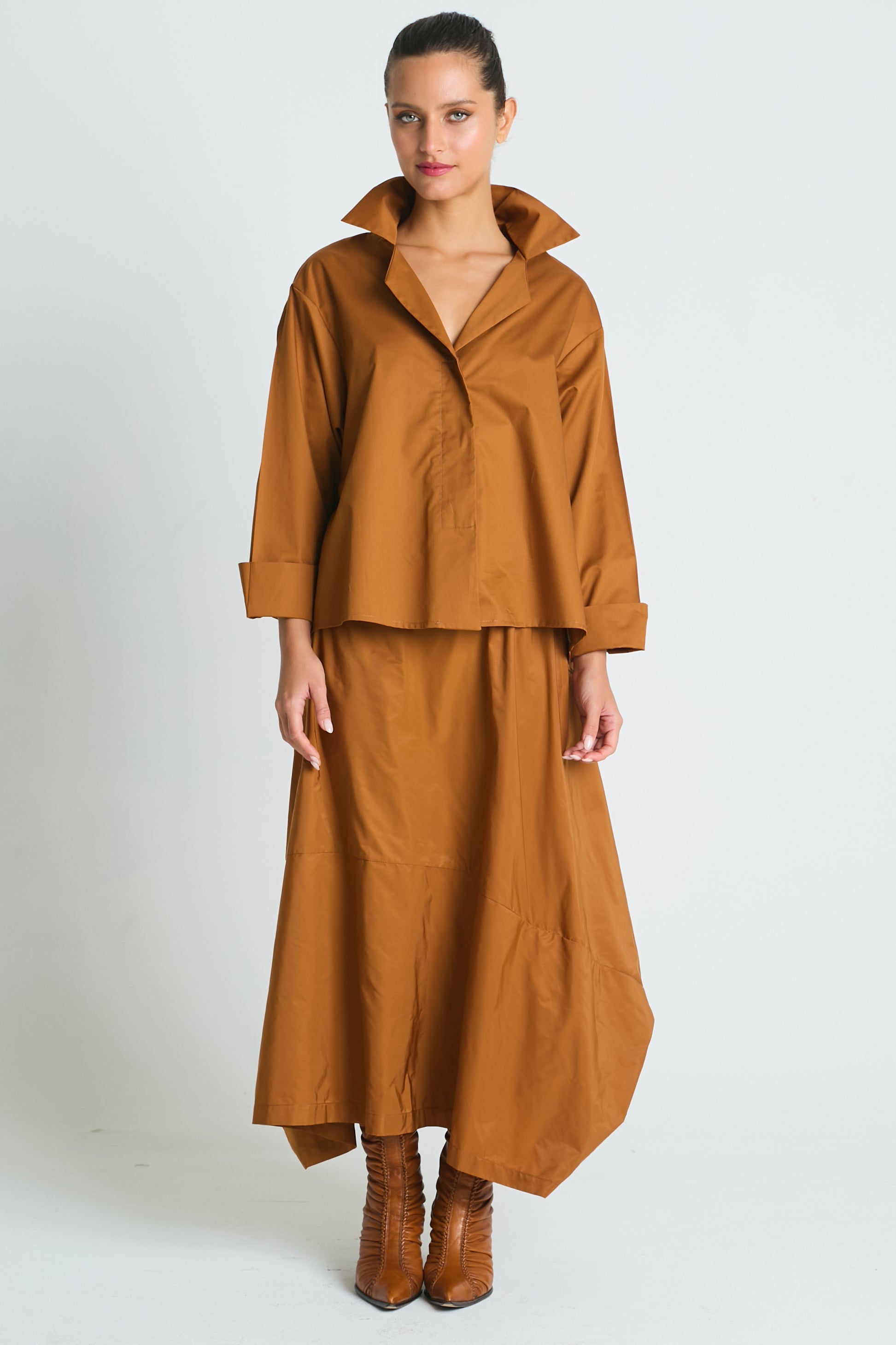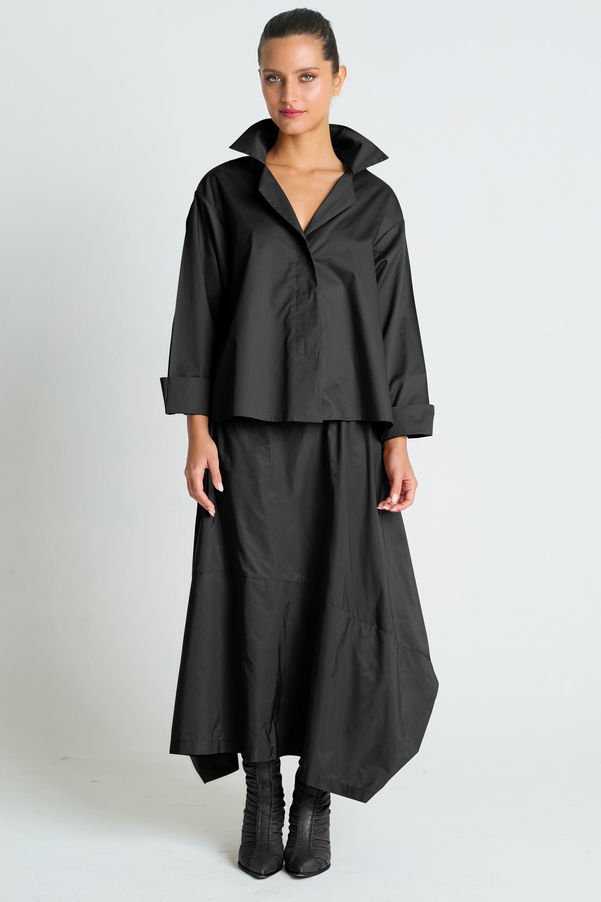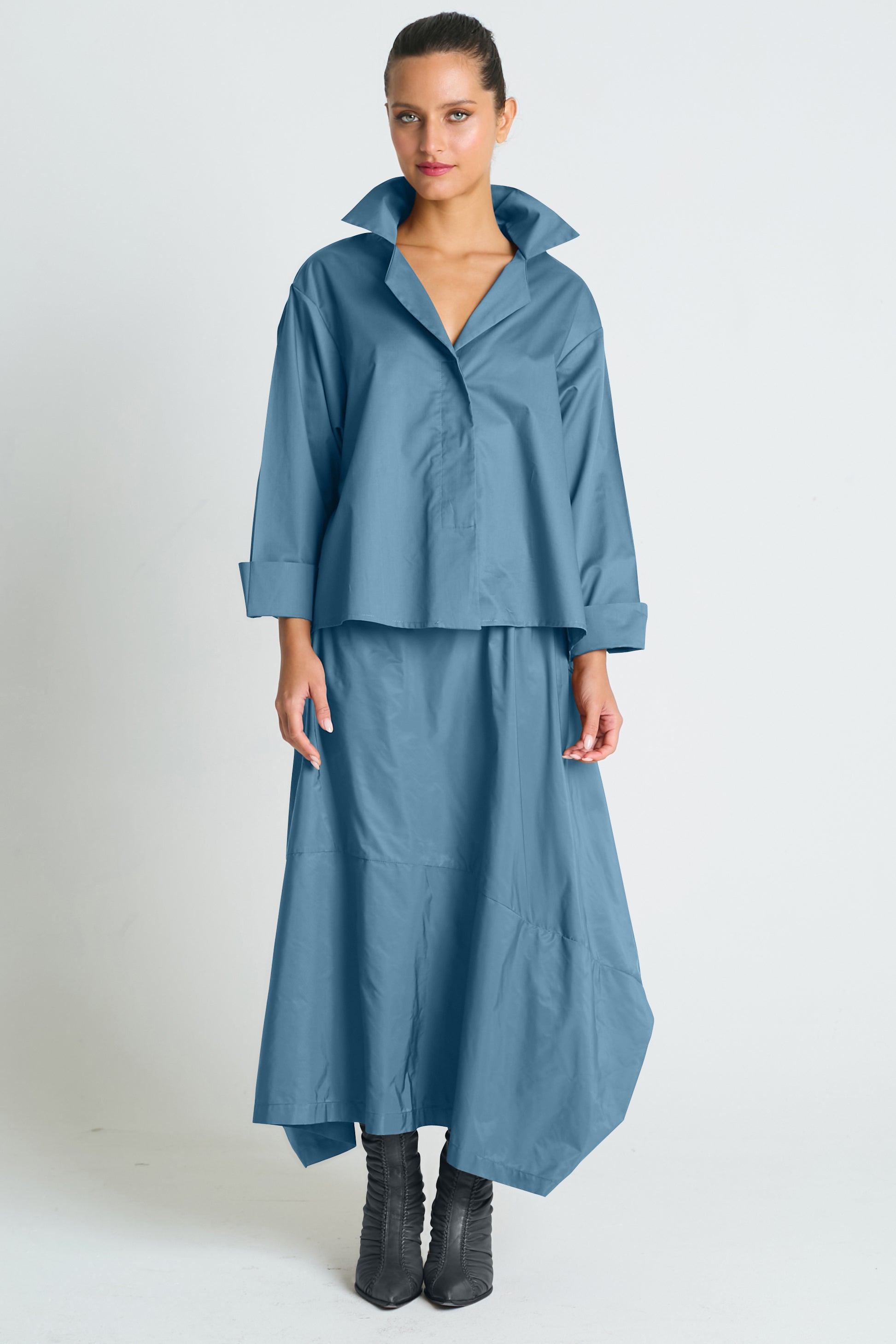 An effortless take on a classic, this crisp cotton poplin top brings structure with a relaxed edge. The wide collar and subtle placket create a polished yet easy-going feel, while the cropped, A-line silhouette drapes beautifully for a modern, flattering fit. Rolled sleeves add a casual touch, making this the perfect layer for styling up or down.