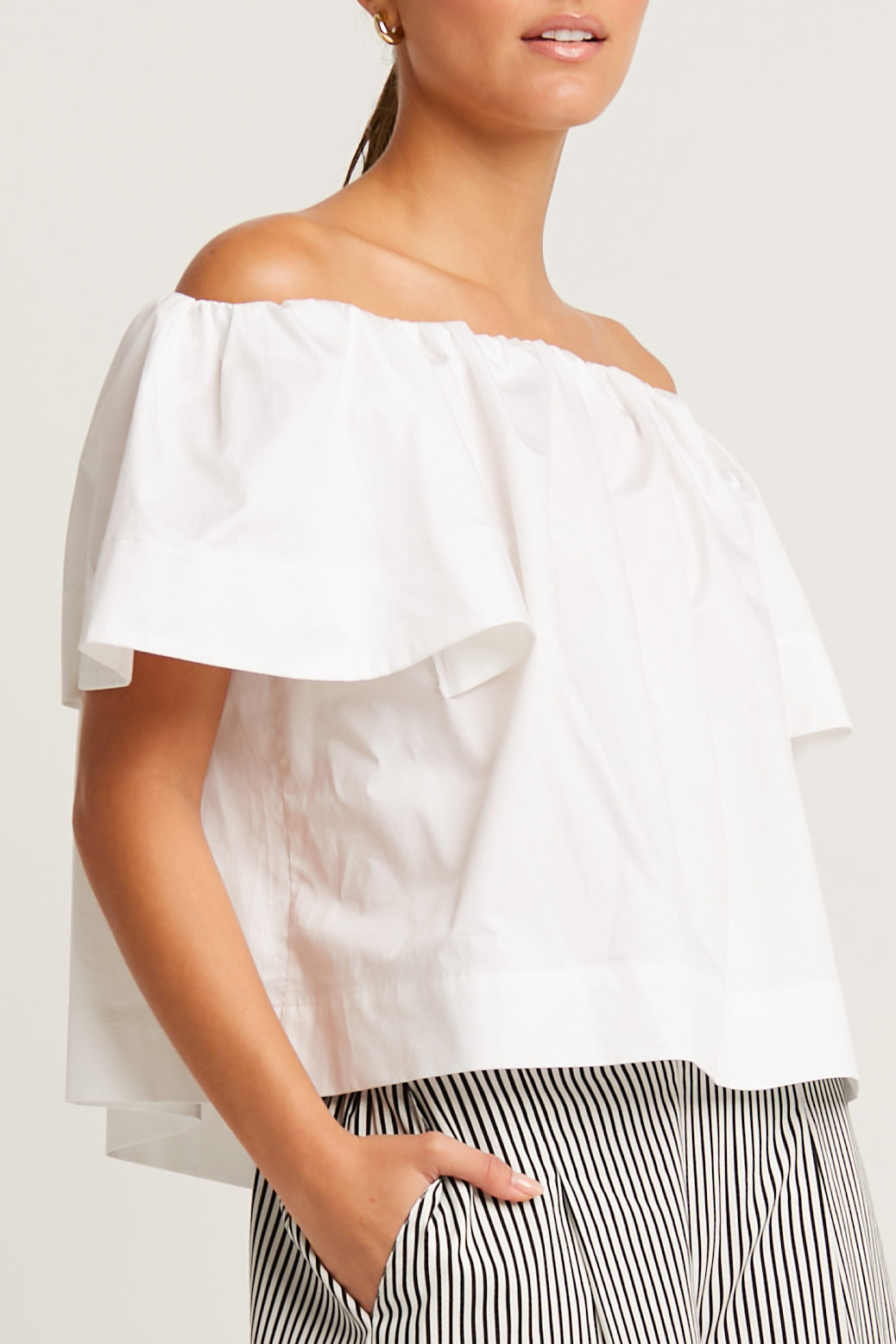 Effortless summer charm meets refined design in this off-shoulder peasant top. Crafted from lightweight cotton, it features a soft drape and fluttery sleeves that gracefully frame the neckline. Perfect for breezy days or an evening out, its versatile silhouette flatters every frame while adding a romantic touch to any outfit.?