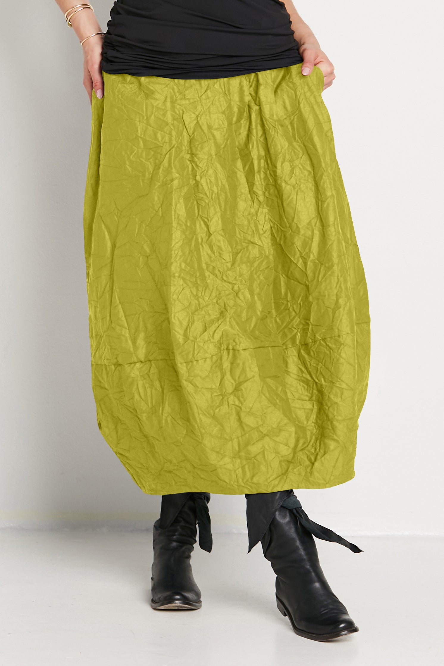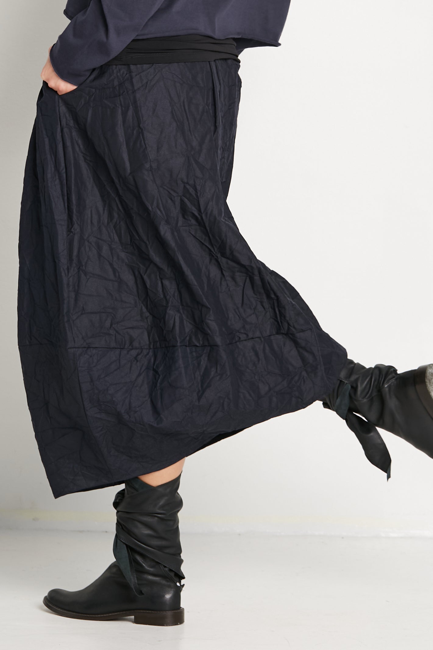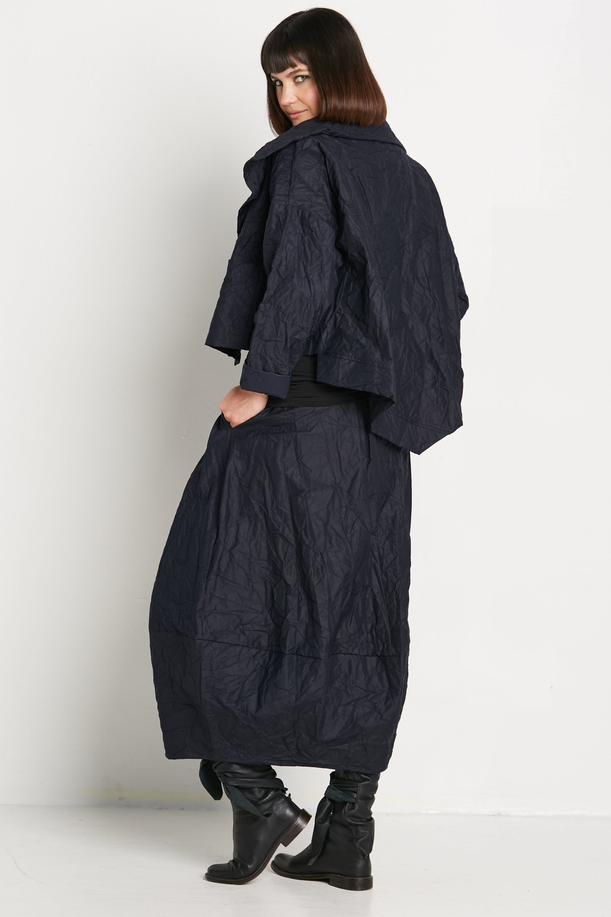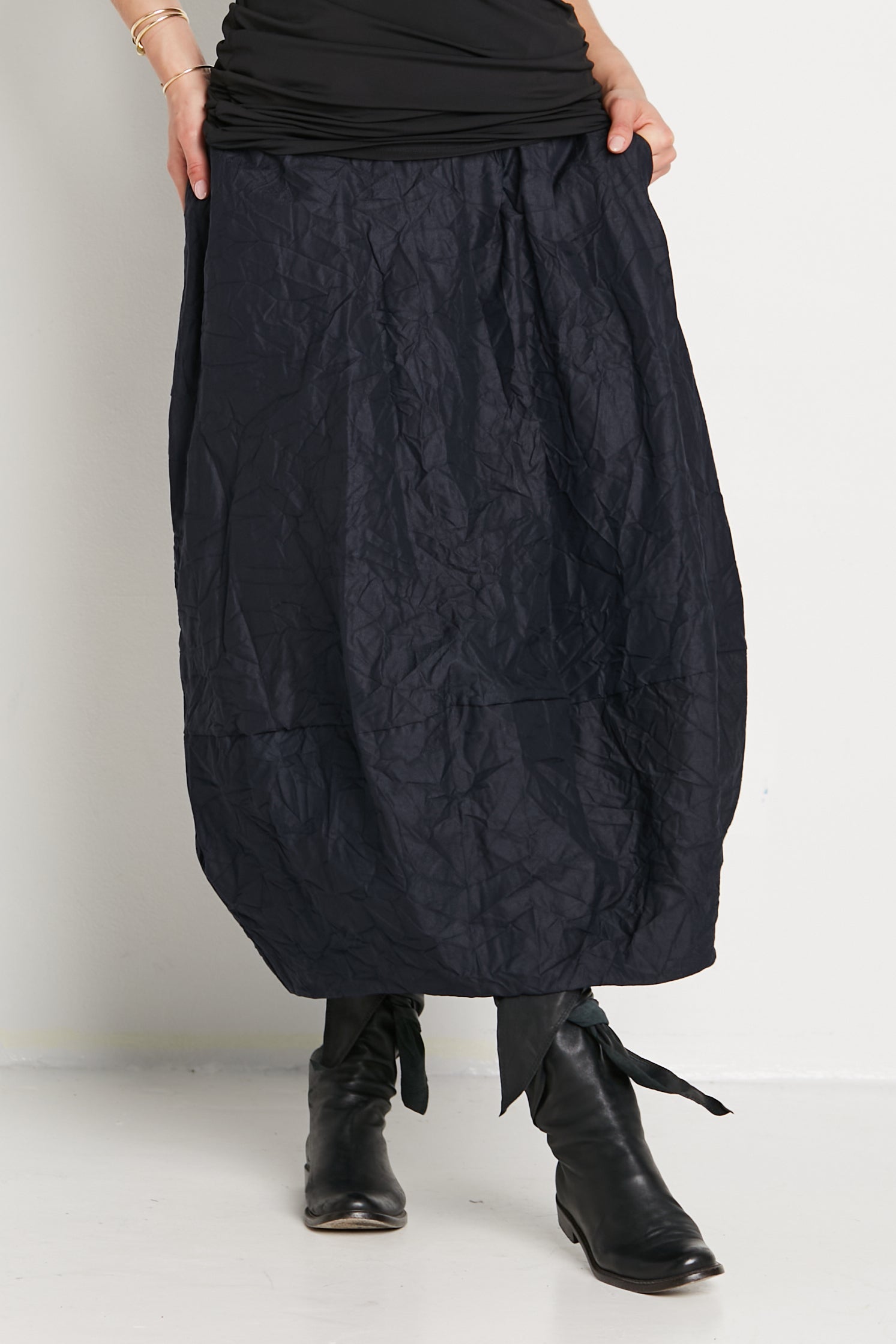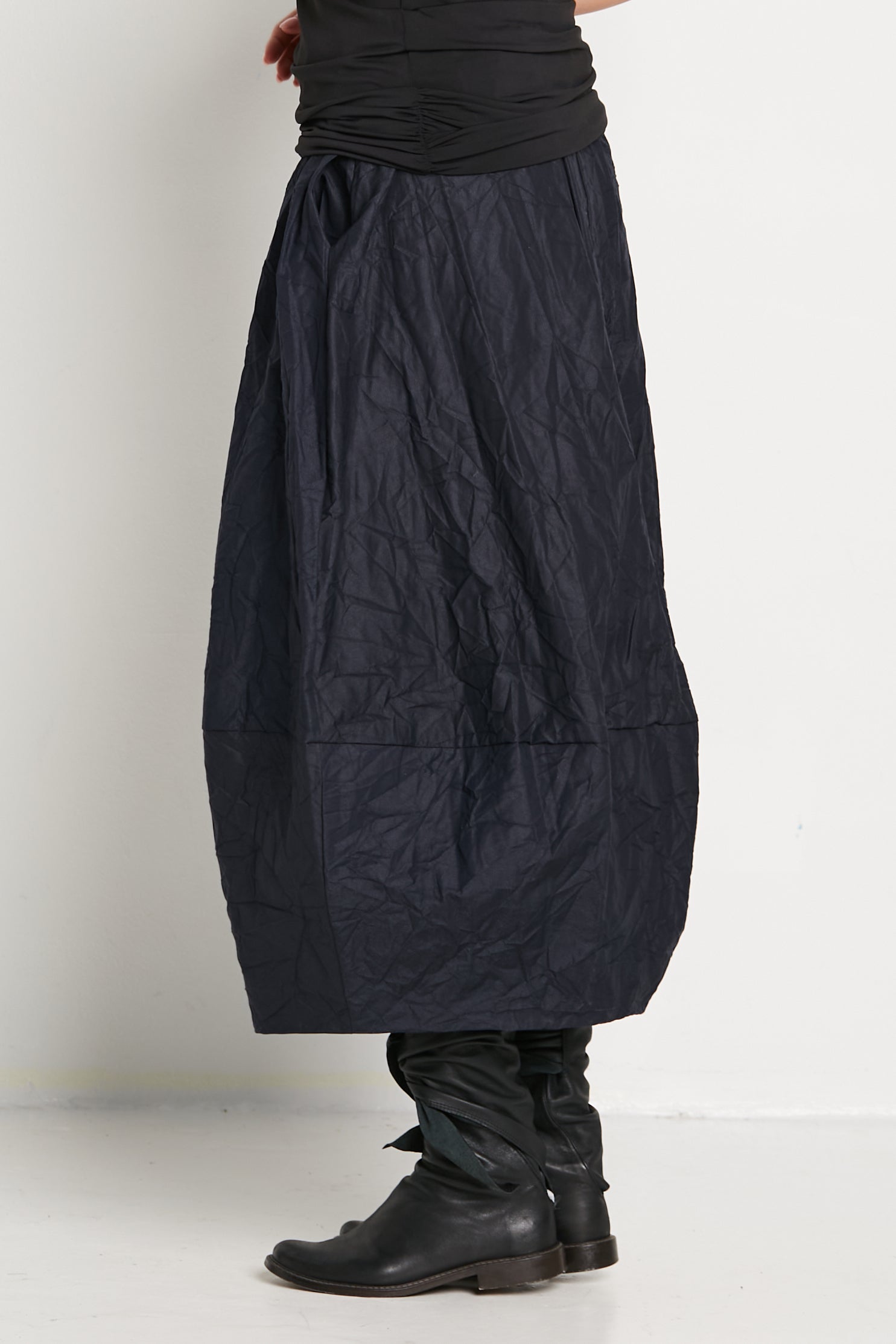 Add a touch of avant-garde elegance to your wardrobe with this skirt. The distinctive crinkled texture not only catches the eye but also provides a soft, tactile experience that feels luxurious against the skin. Its lightweight yet durable fabric ensures ease of movement, making it a versatile piece that transitions seamlessly from casual days to sophisticated evenings.