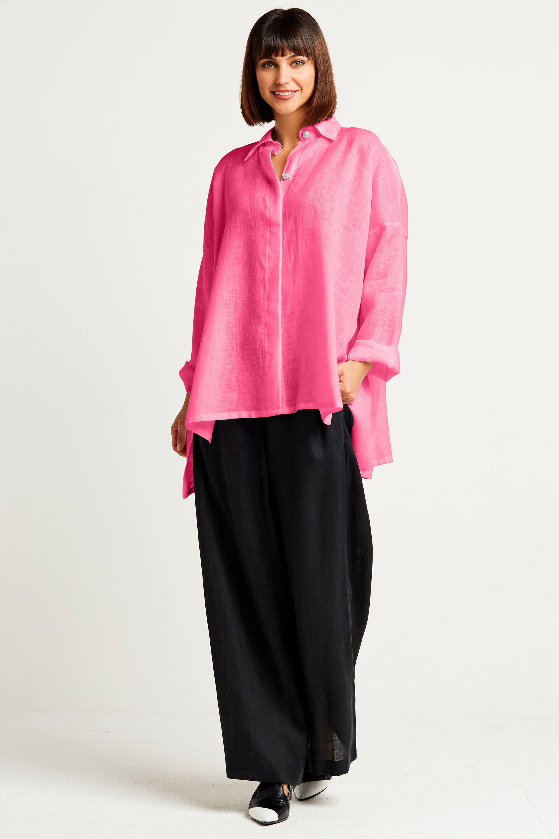 Breezy, breathable, and endlessly versatile - this handkerchief linen button-down blends soft structure with effortless flow. Crafted from fine Irish linen, it features a poppable collar, hidden placket, and a relaxed silhouette that flatters every frame. Lightweight with just the right amount of polish, it¡¯s a warm-weather essential you¡¯ll reach for season after season. Wear it buttoned, layered, or open¡ªthe ease is built in.