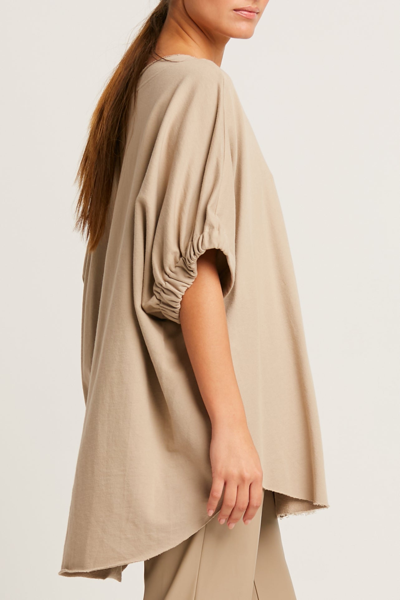 Reimagining casual elegance, this tee?delivers comfort and effortless style in a soft, premium terry fabric. Its oversized silhouette and raw-edge hem offer a contemporary edge, while the gathered sleeve detail elevates its relaxed aesthetic. Designed for versatility, this piece pairs effortlessly with wide-leg pants for daytime ease or sleek trousers for a chic, laid-back look.