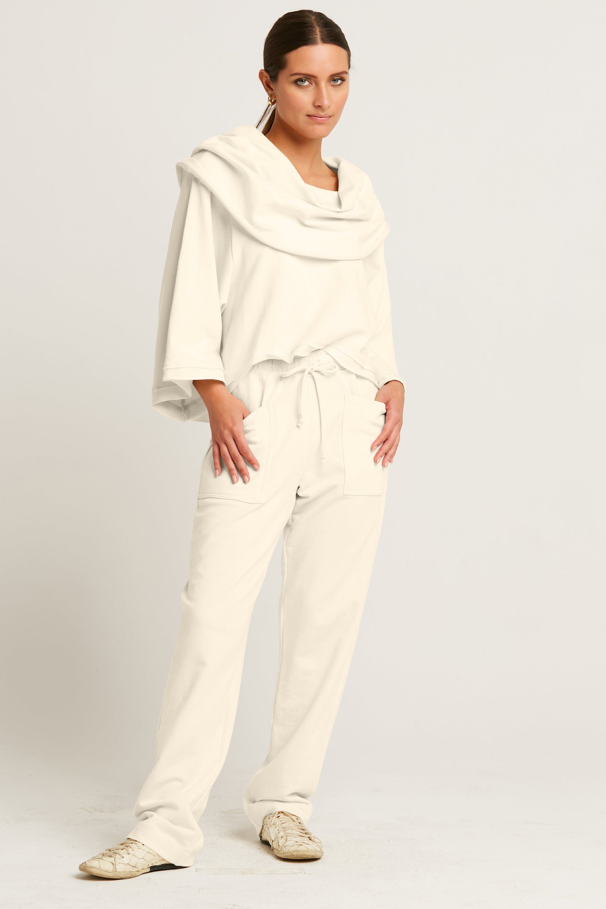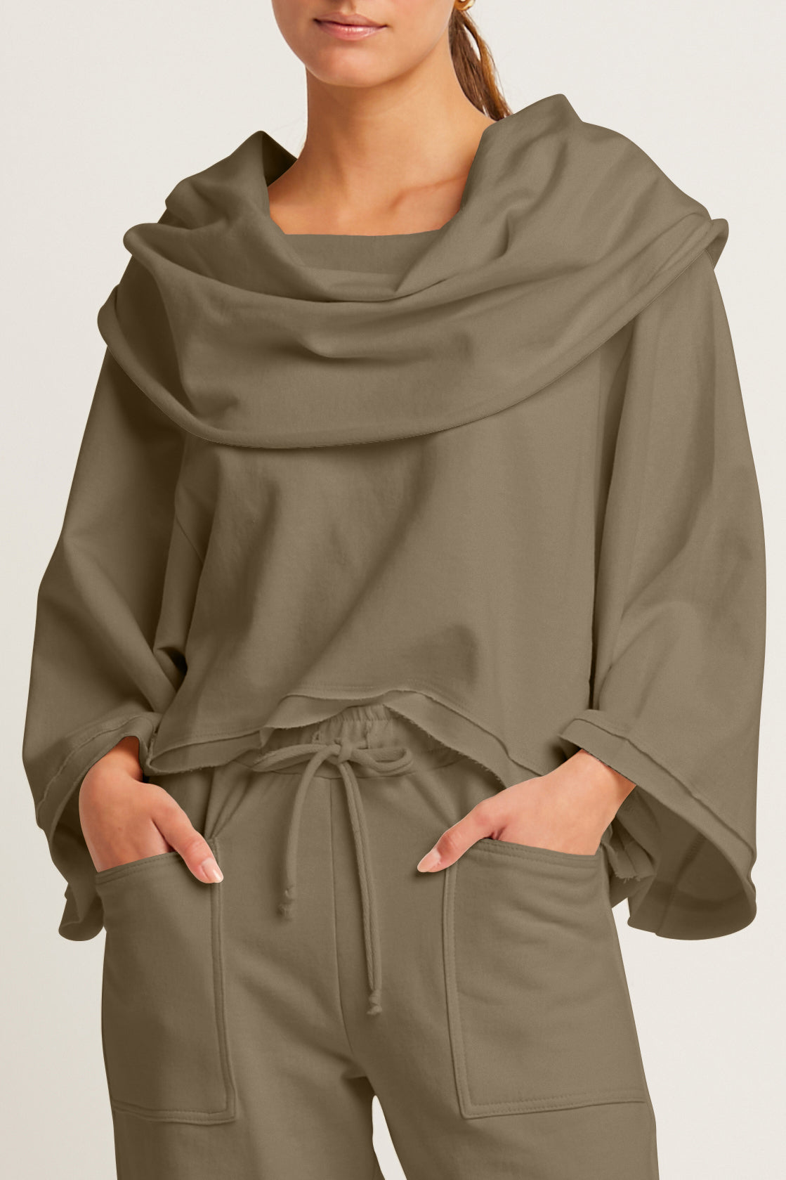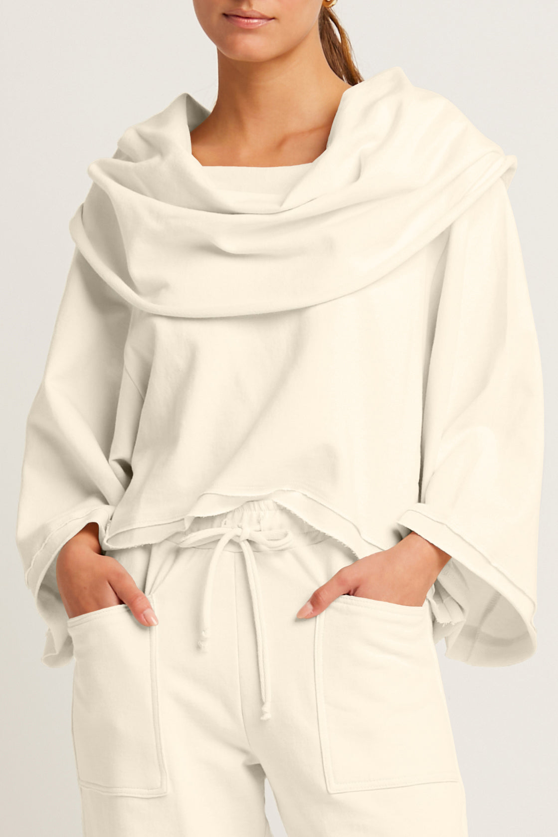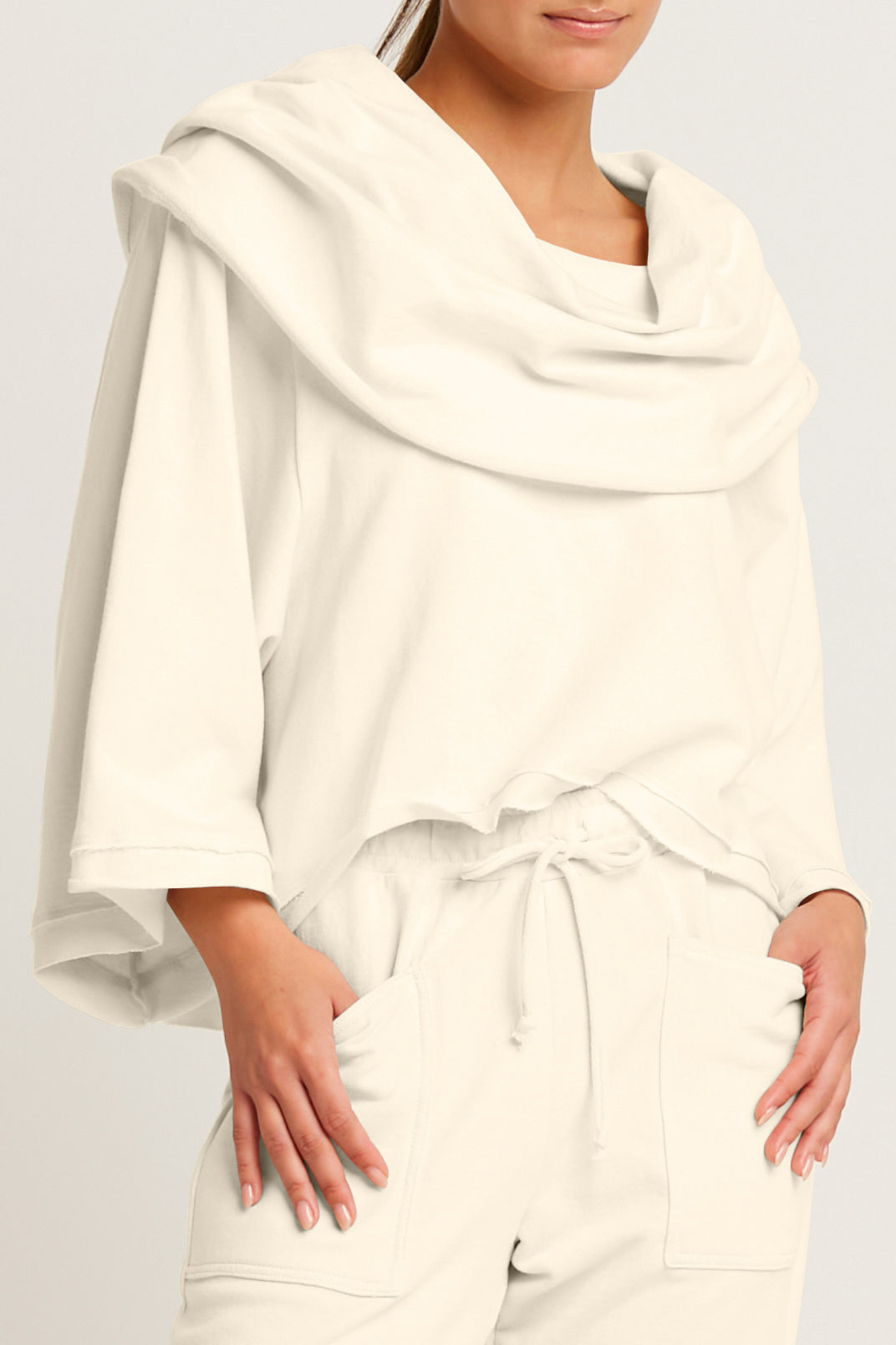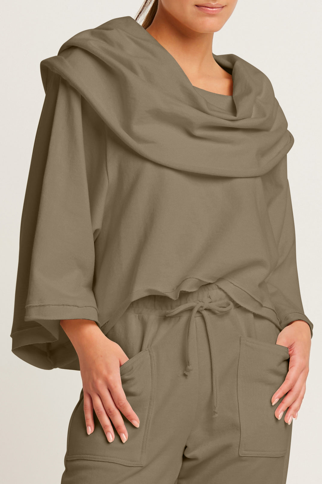 Timeless ¡°Jackie O¡± french terry cropped cowl top is the perfect 'work-out, go-out' relaxed athleisure item. Features kimono-like sleeves for added ease and comfort.? A great addition to a lounge wardrobe.? ?
