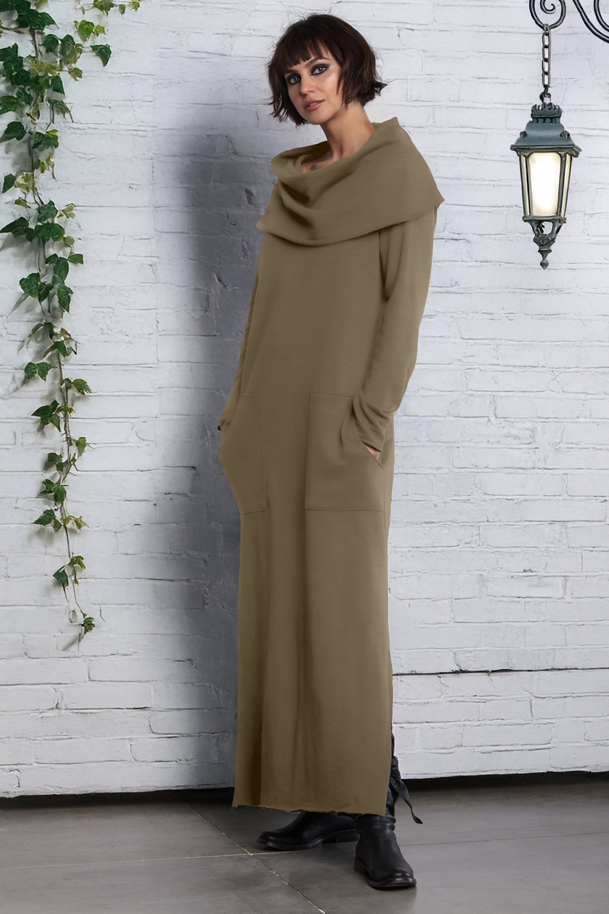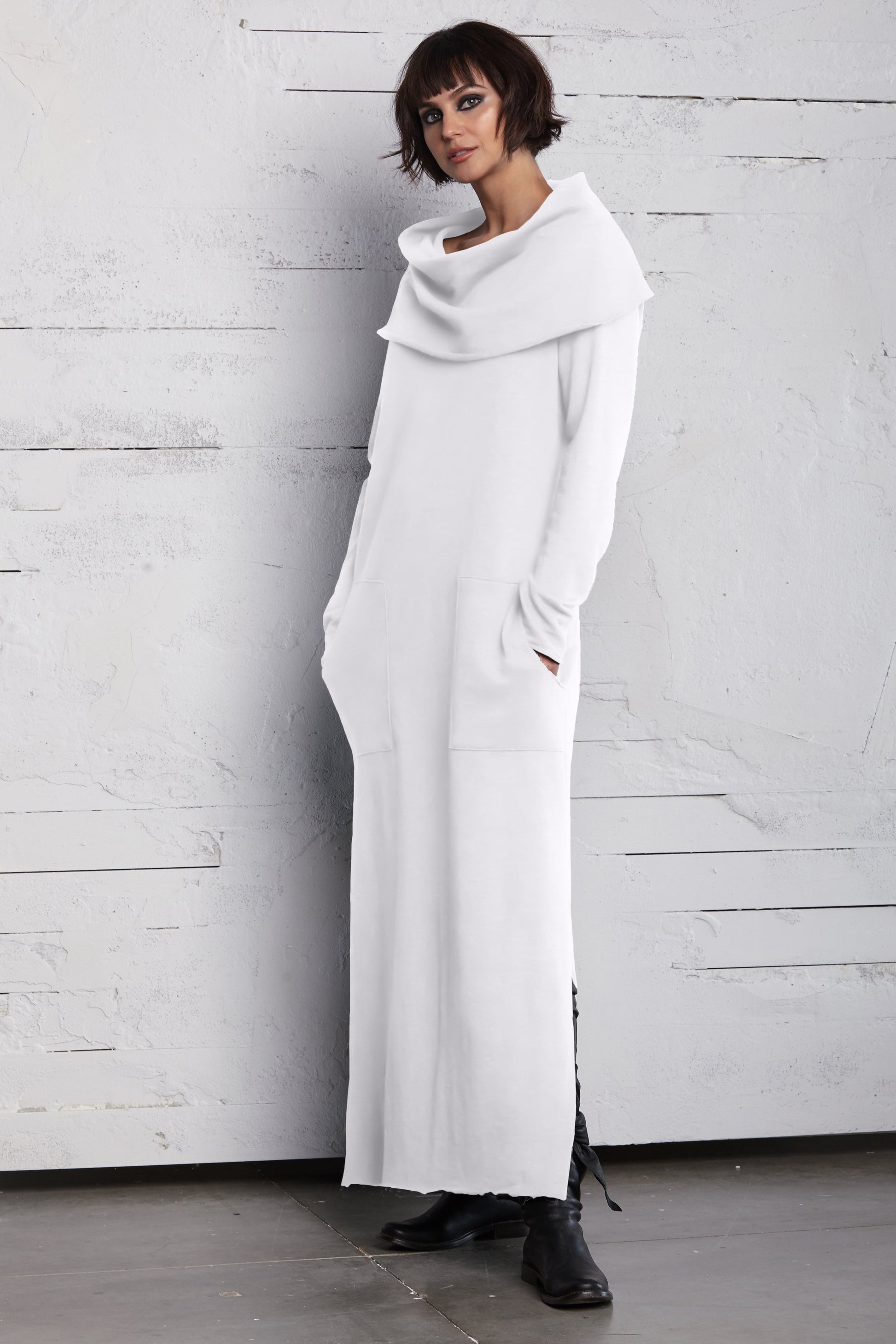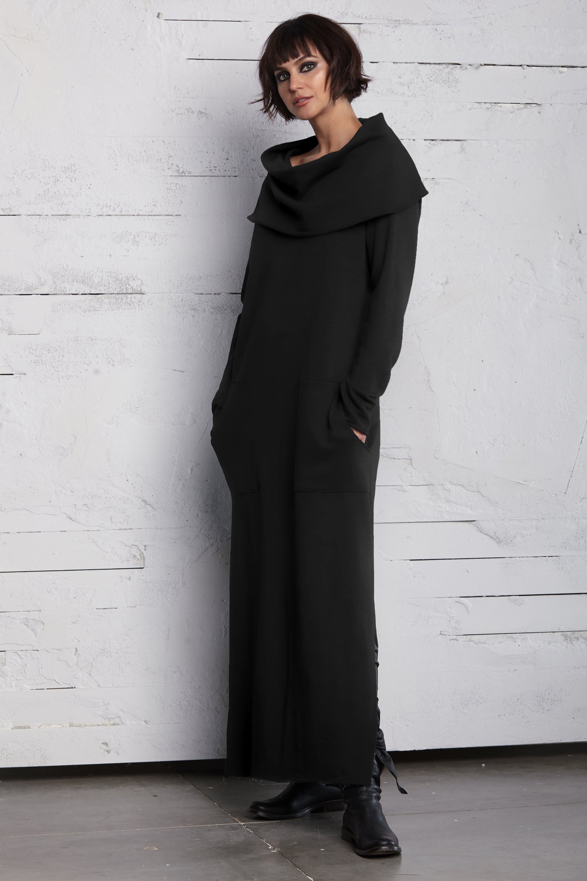 Wrap yourself in effortless elegance with this French terry dress. Featuring a dramatic cowl neckline and a relaxed silhouette, this piece combines cozy comfort with elevated style. The soft French terry fabric drapes beautifully, while the long length and patch pockets add both sophistication and functionality. Perfect for lounging or stepping out, this dress offers the perfect balance of chic and comfort.?