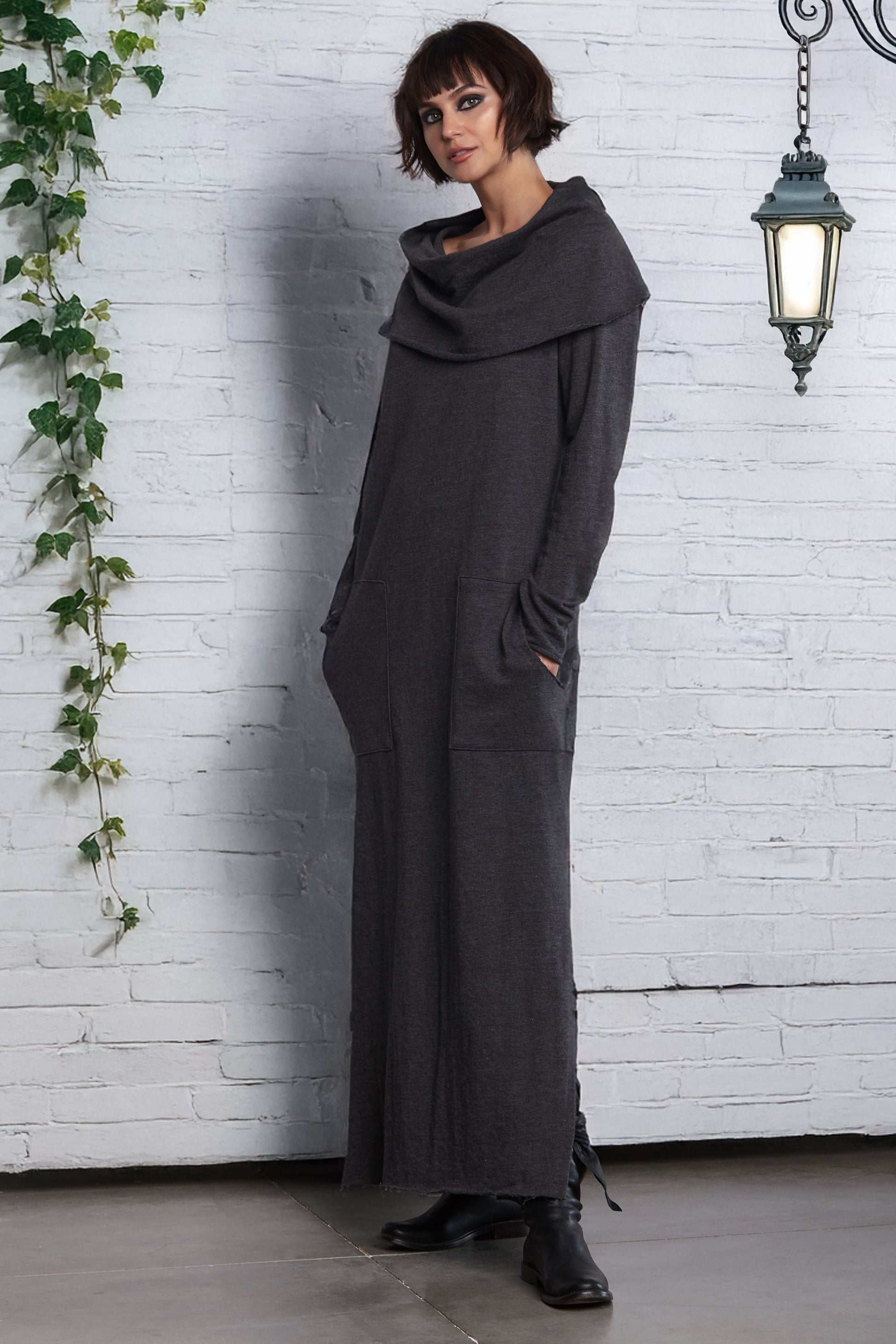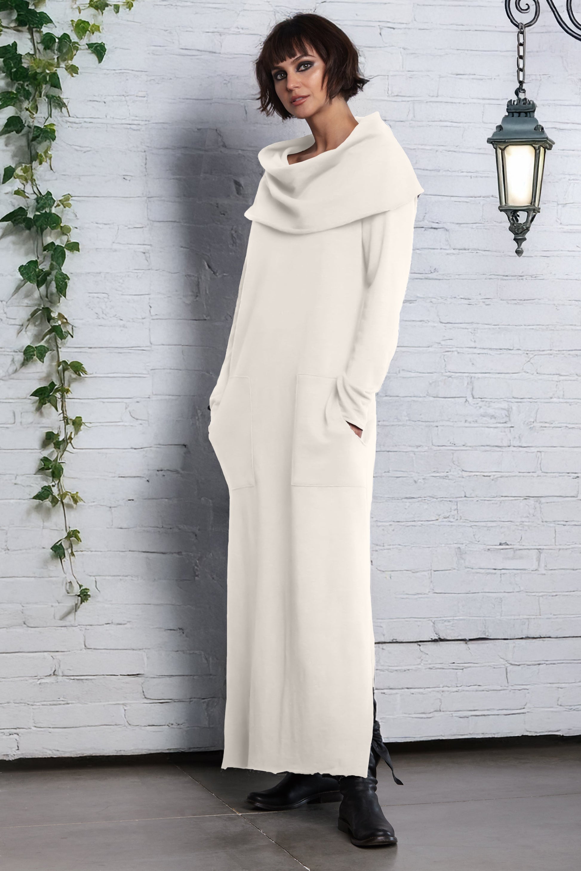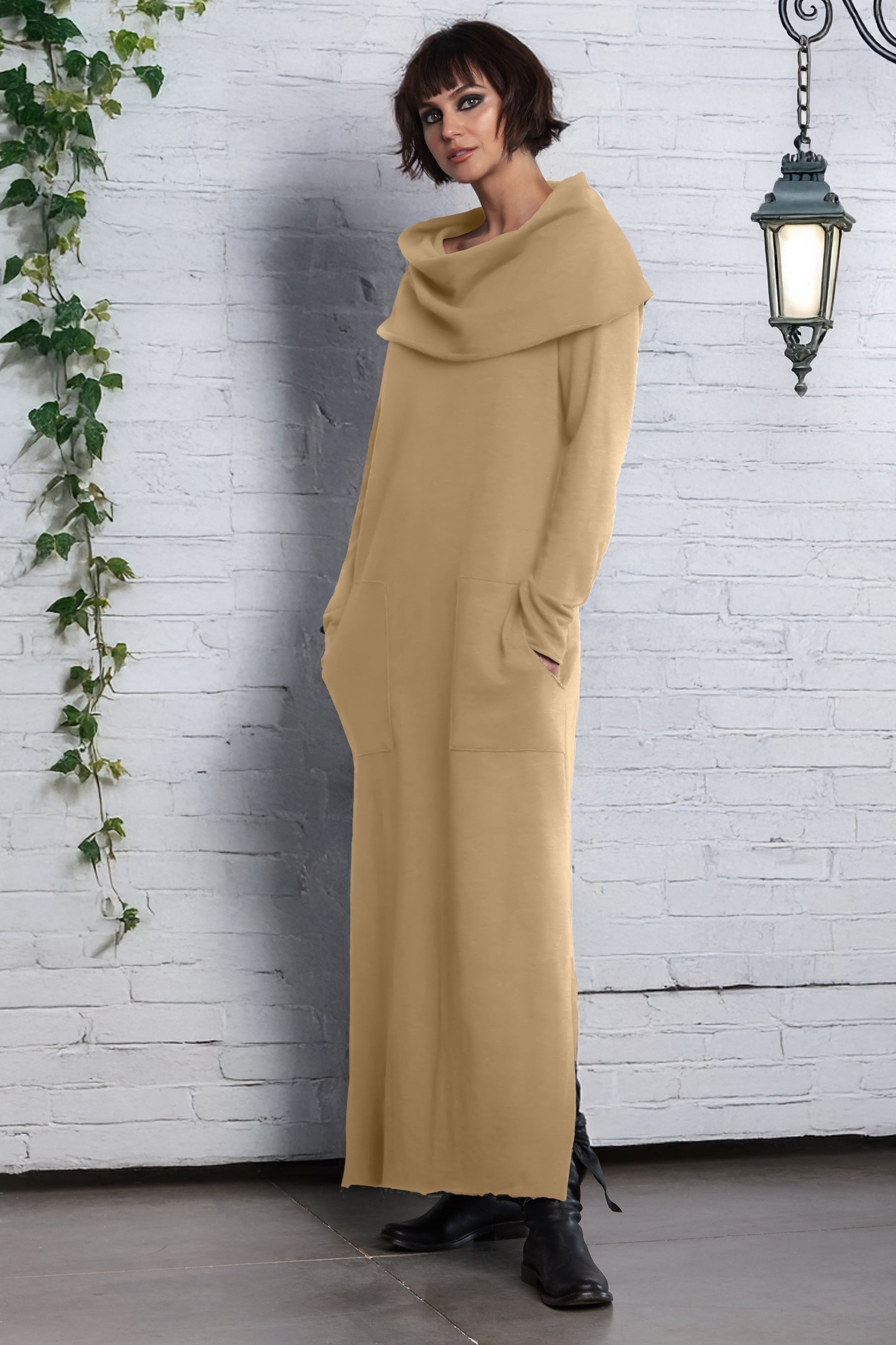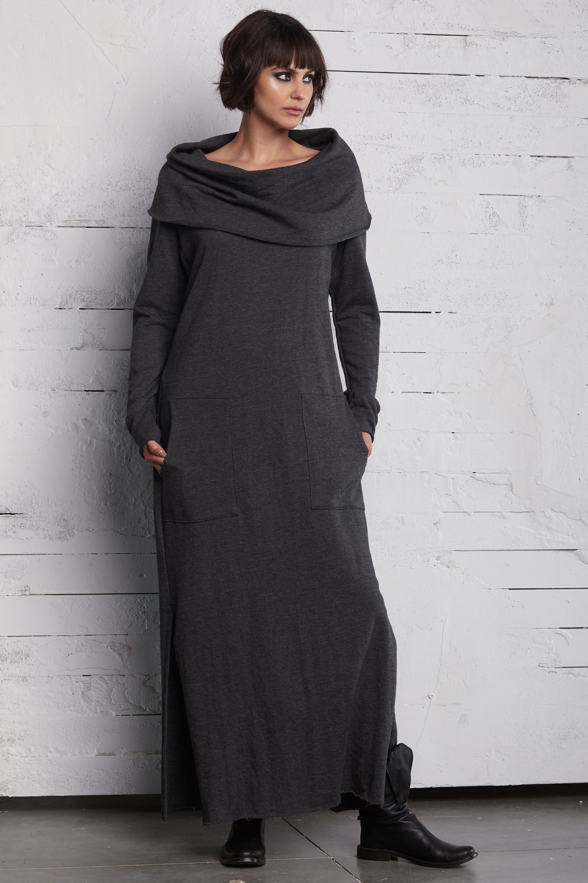 Wrap yourself in effortless elegance with this French terry dress. Featuring a dramatic cowl neckline and a relaxed silhouette, this piece combines cozy comfort with elevated style. The soft French terry fabric drapes beautifully, while the long length and patch pockets add both sophistication and functionality. Perfect for lounging or stepping out, this dress offers the perfect balance of chic and comfort.?