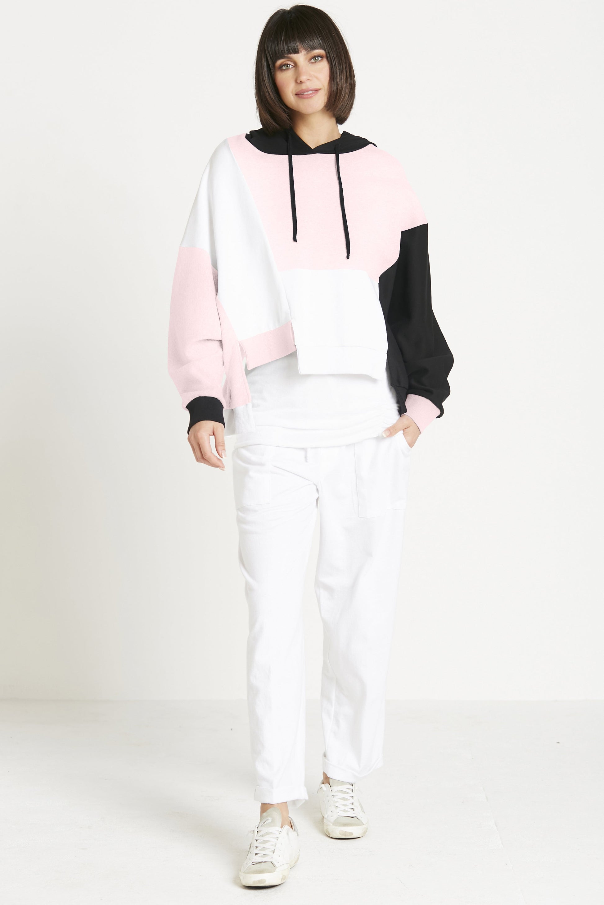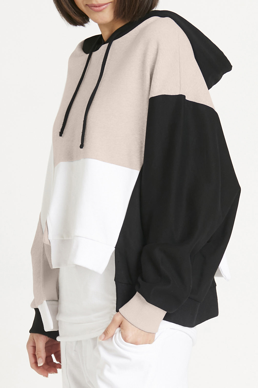 This French Terry hoodie is a contemporary twist on leisurewear with its color-blocked design and relaxed silhouette. Its cozy material and versatile style make it ideal for the modern woman who seeks both comfort and chic sophistication in her daily wear. It's the perfect blend of casual and trendy, ideal for those weekend getaways or laid-back evenings.? Features notched hem and raw edges.