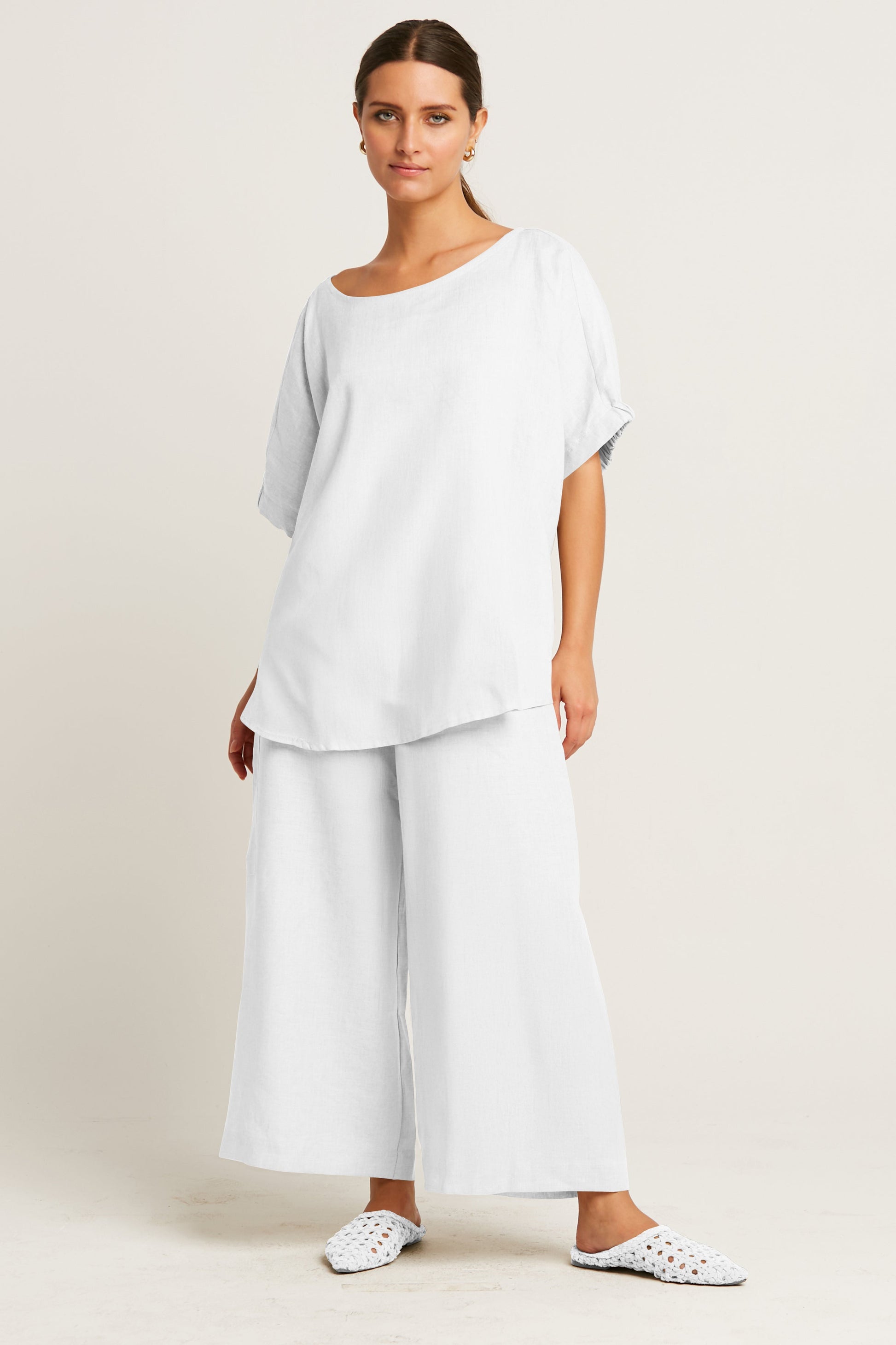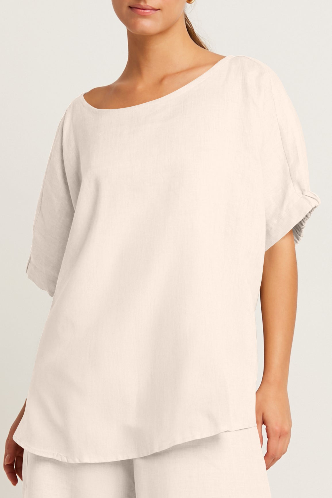 Crafted from breathable handkerchief linen, this tee embodies effortless sophistication with its relaxed silhouette and elevated details. The airy drape ensures all-day comfort, while the subtle gathered sleeves add a refined touch. Perfectly versatile, it transitions seamlessly from casual mornings to chic evenings.