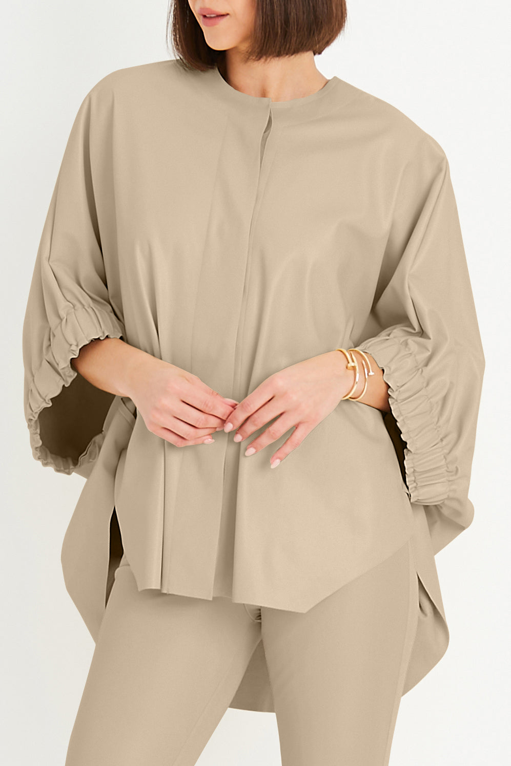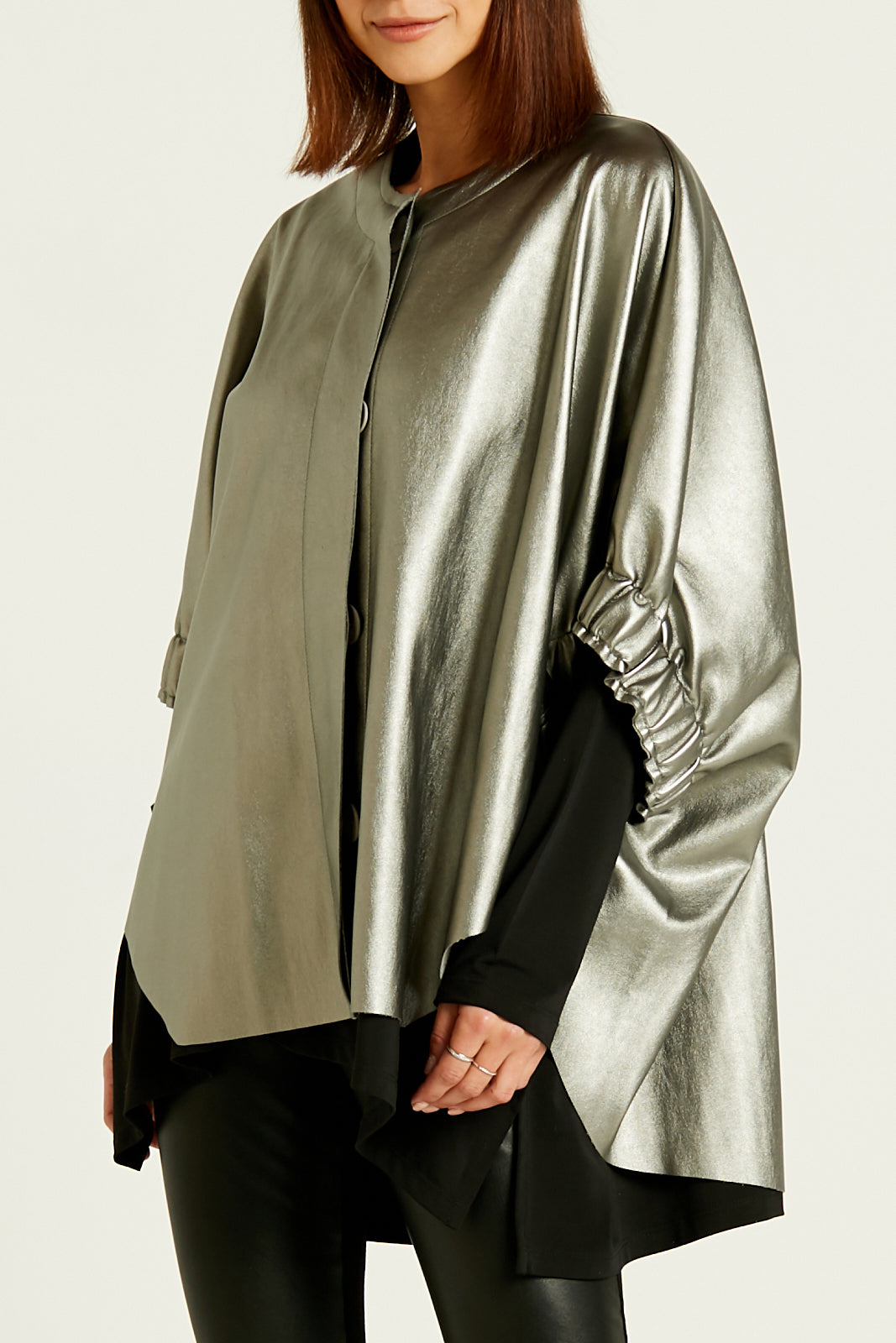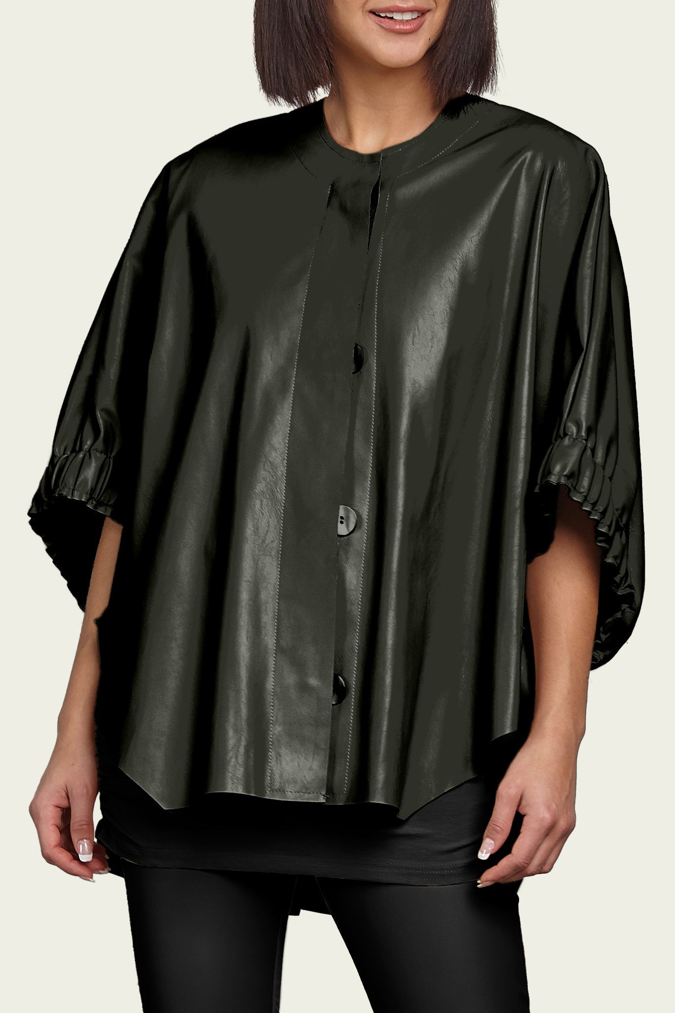 Infuse your wardrobe with the charm of 'The Marvelous Mrs. Maisel' through this exquisite vegan leather creation. It exudes the show's vintage chic with its vest-like cut and sophisticated elbow sleeves. The buttoned front and drop shoulders add a touch of the show's playful yet poised elegance, perfect for the woman who commands the room with her style and wit.