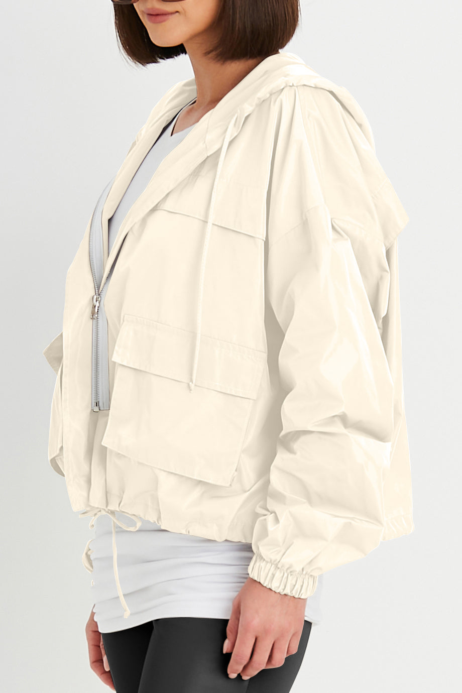 This nylon jacket is the epitome of urban chic, featuring a drawstring waist for a customizable silhouette and an array of pockets for functionality. Its oversized hood and voluminous sleeves make a bold fashion statement, while the lightweight fabric ensures comfort and ease of movement. Ideal for the dynamic woman who values both practicality and style in her outerwear.