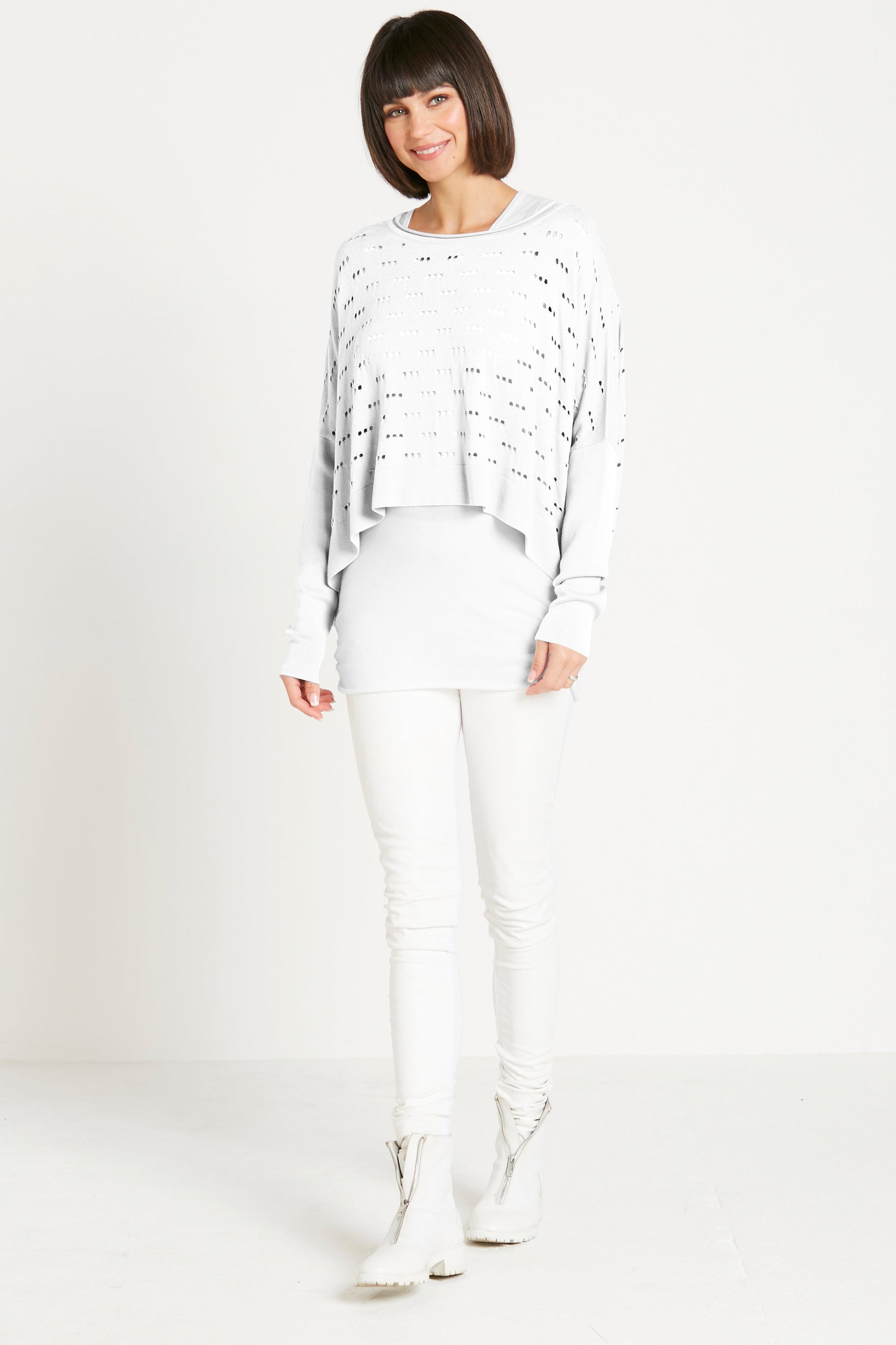 'Style punch, 3x!? Our ultra-soft novelty knit is loaded with style, having just the right amount of edge.? Drapes aways from the body, while ever so flowy and airy.? Features drop shoulders and hi-lo hem.?