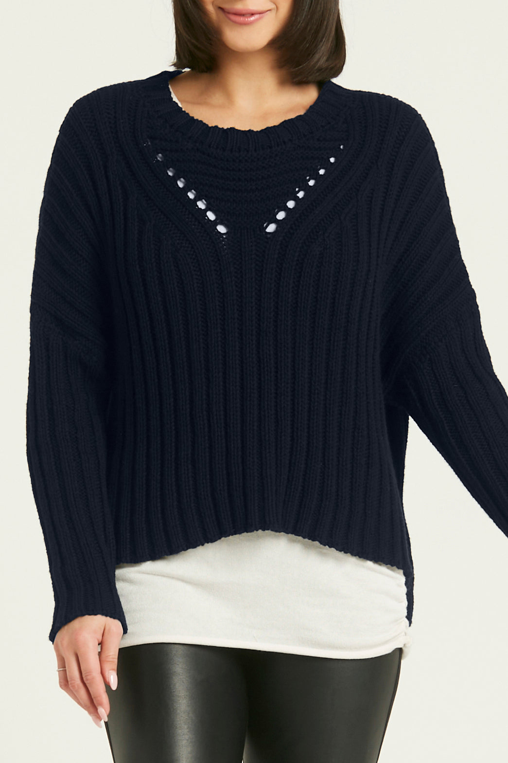 This timeless chunky crewneck sweater is deliciously cozy with a relaxed elegant fit and beautifully crafted unique openwork.? Finished in our textured rib Pima cotton luxury knit, this forever classic is an absolute pleasure to wear season after season.? While it's chunky, the style veers towards the lighter side.? Features drop shoulders and drape ever so lightly from the body.?