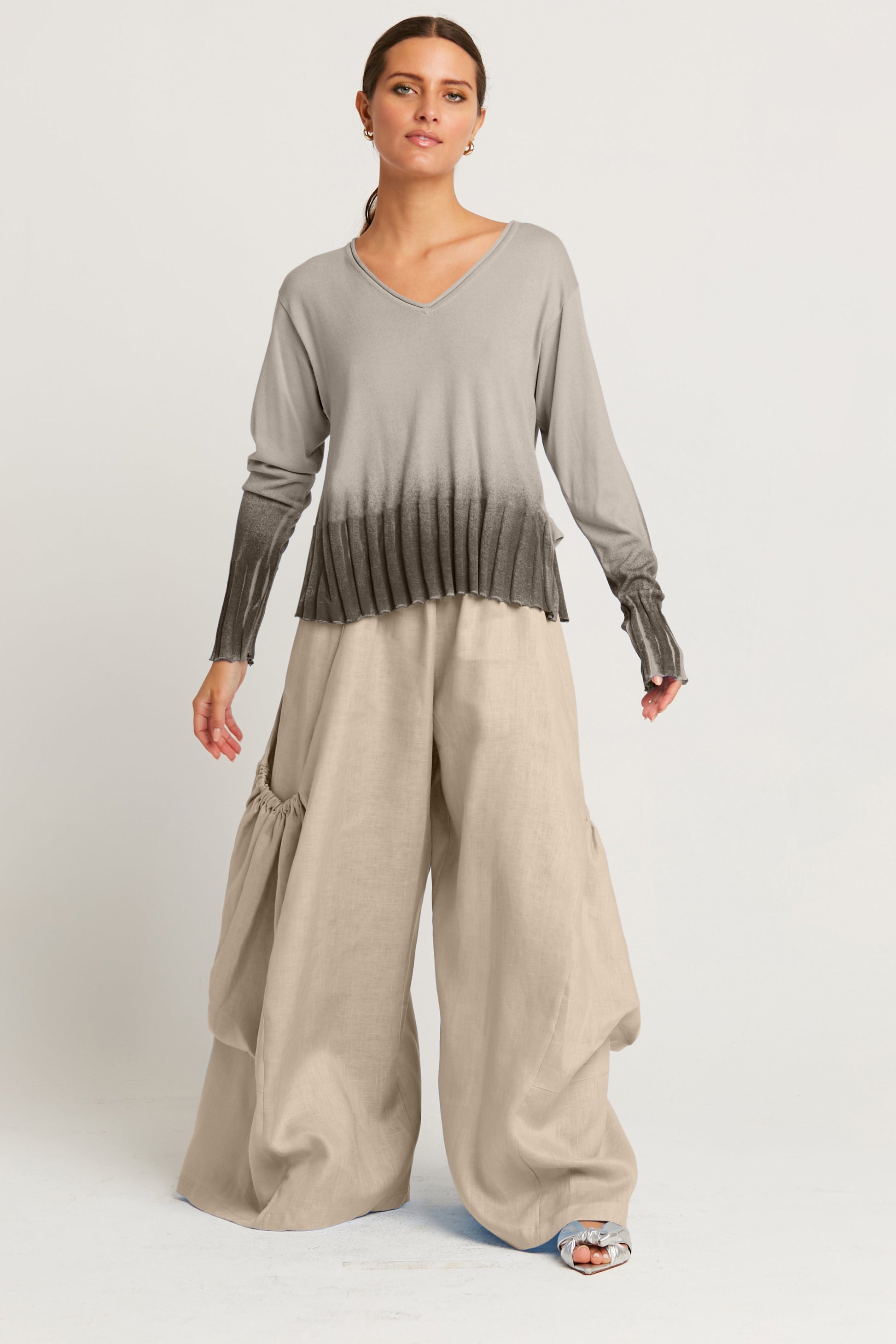 This sweater embodies a dreamy ombre effect, blending soft tones into a mesmerizing pleated hemline for a contemporary twist on a classic silhouette. Crafted from luxurious Pima Cotton, its V-neckline and subtle fade bring a refreshing elegance to your wardrobe. Perfect for breezy days and layering over your favorite essentials, this knit celebrates effortless style and comfort in one bold design.