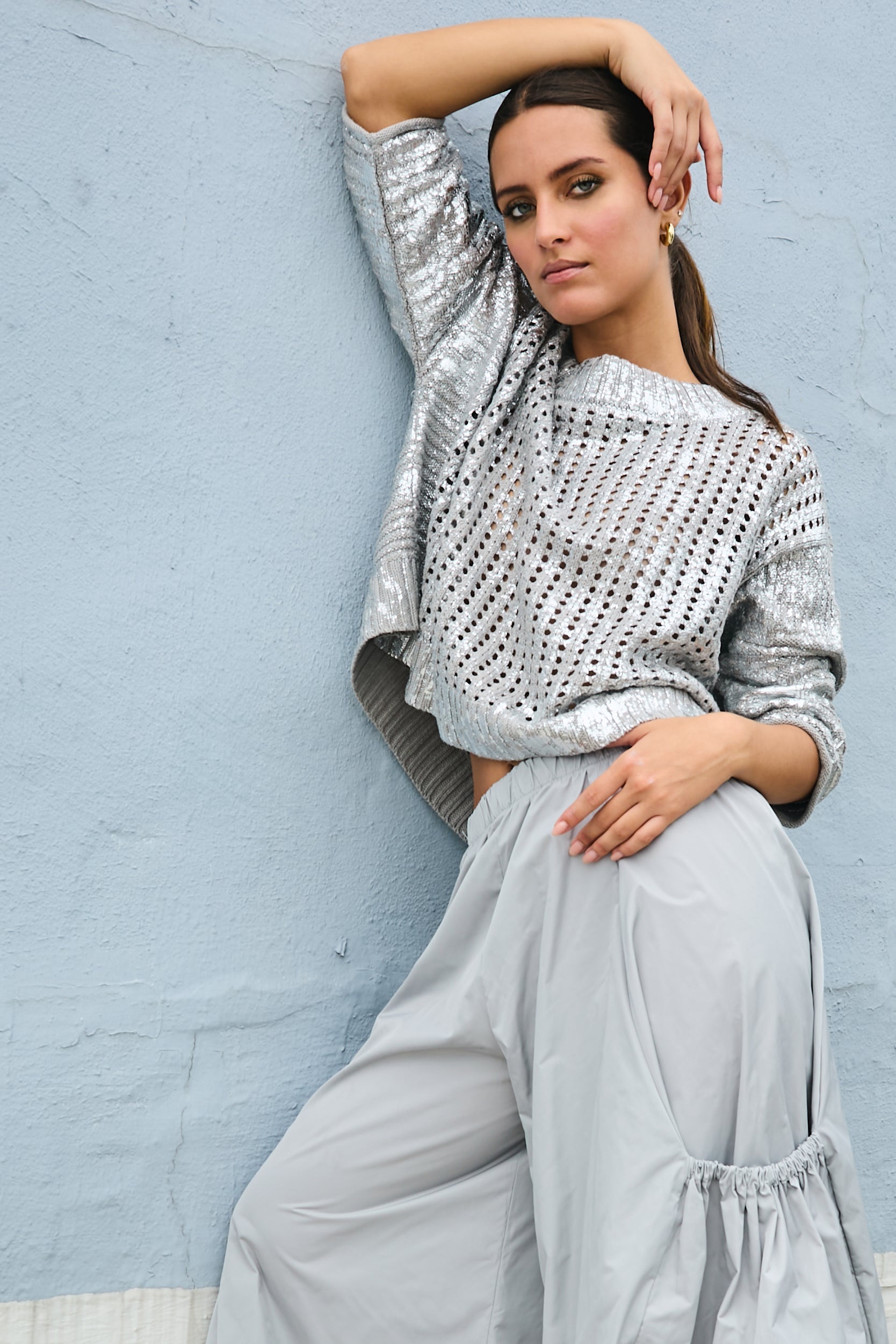 Crafted from the finest Pima cotton, this exquisite piece features shimmering metallic threads woven into a delicate open crochet design, making it the ultimate statement sweater. With its drop shoulder, ribbed sleeve detailing, and bi-level hem, this sweater effortlessly combines relaxed sophistication with a touch of glam. Whether you¡¯re attending a chic dinner party, meeting friends for an impromptu get-together, or heading to a soir¨¦e, this sweater will ensure you stand out in style.?