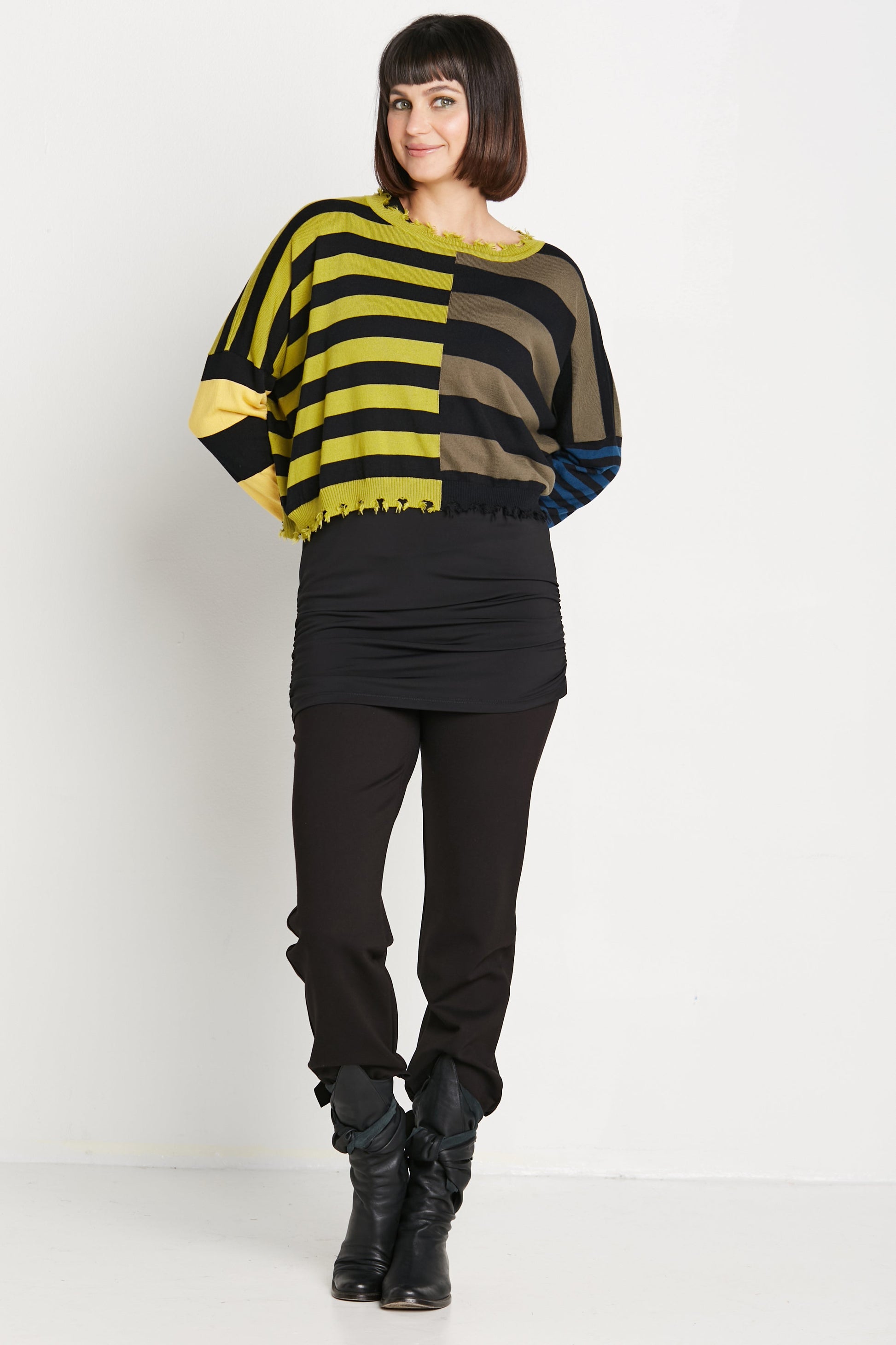 Embrace a playful take on casual wear with this Pima cotton crewneck sweater. Featuring a bold mix of stripes and a tattered finish, it exudes an effortless, edgy charm. The ultra-soft, breathable fabric ensures all-day comfort, while the relaxed fit offers a laid-back vibe. This sweater adds a touch of individuality to your wardrobe, perfect for those who love to mix things up with style and comfort.?