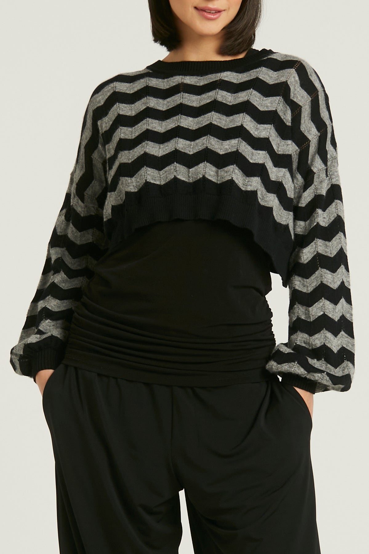 Zig Zag your way into chic; and style between the lines! While our zig-zag pattern is known to be playful, it's also versatile enough for both casual and luxury events. Our shrug-like style is made with our luxury Peruvian Pima and lightweight ultra-soft hypoallergenic baby alpaca wool. A layer you'll want to wear all year long. Features drop shoulders and blouson sleeves.?