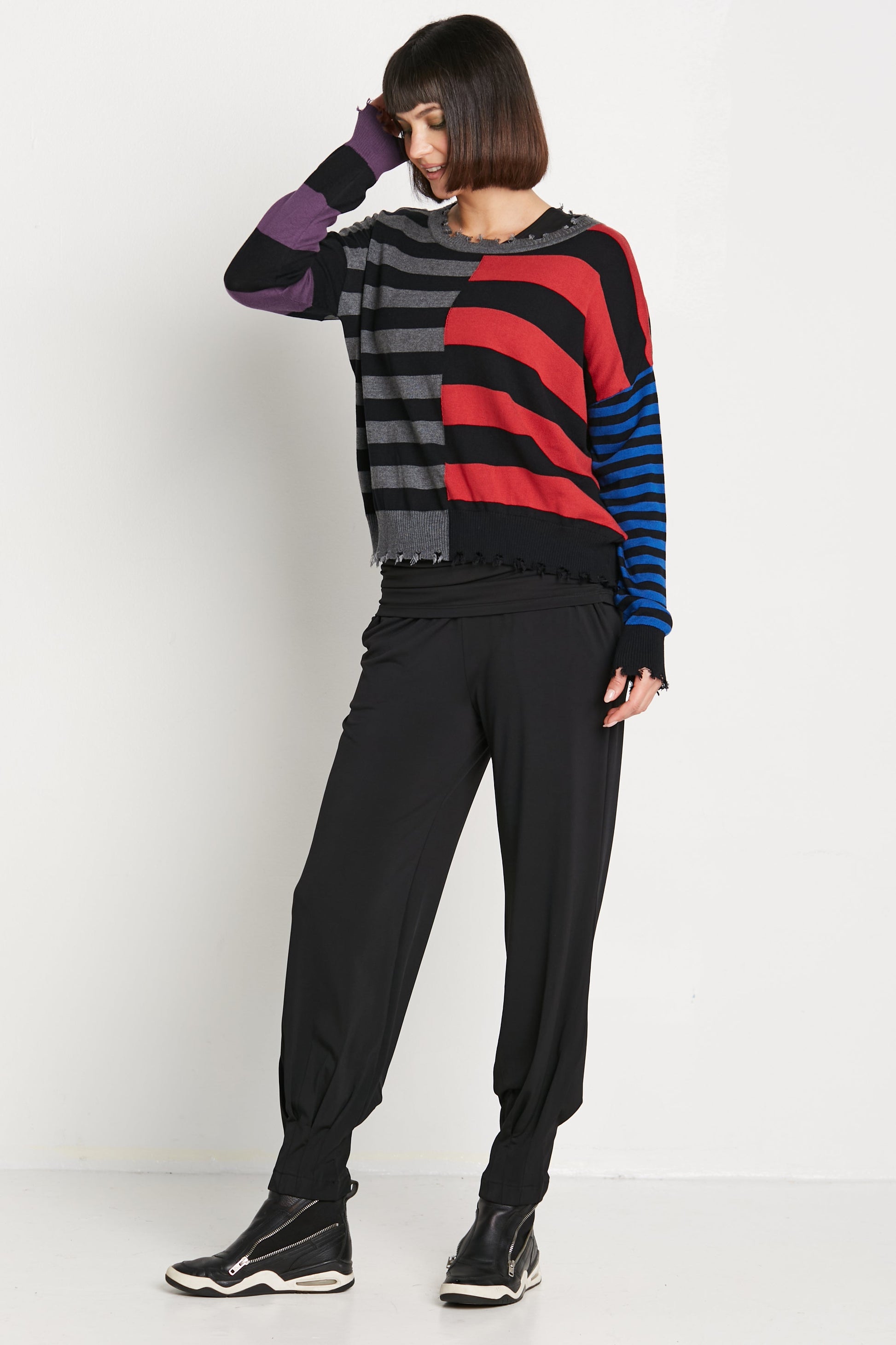 Infuse your wardrobe with bold style and comfort with this luxuriously soft crewneck sweater. Featuring a unique mixed stripes design with tattered edges, this piece exudes modern edge and effortless chic. Its relaxed fit ensures all-day comfort, making it perfect for adding a statement to both casual and dressed-up looks.