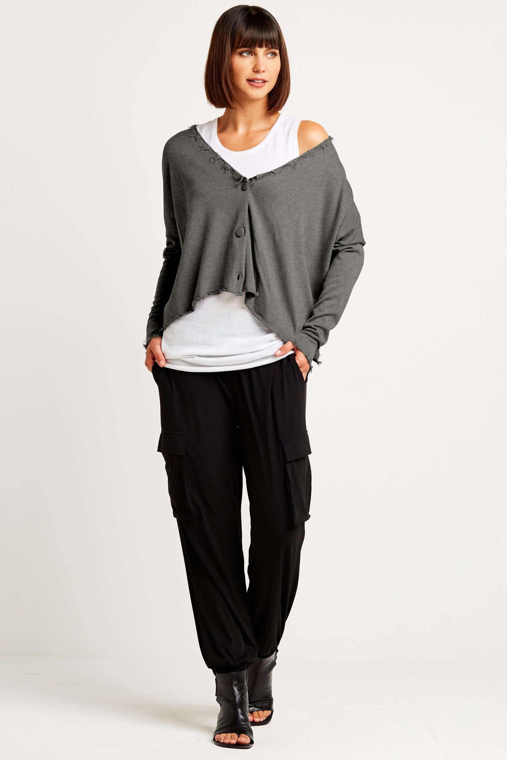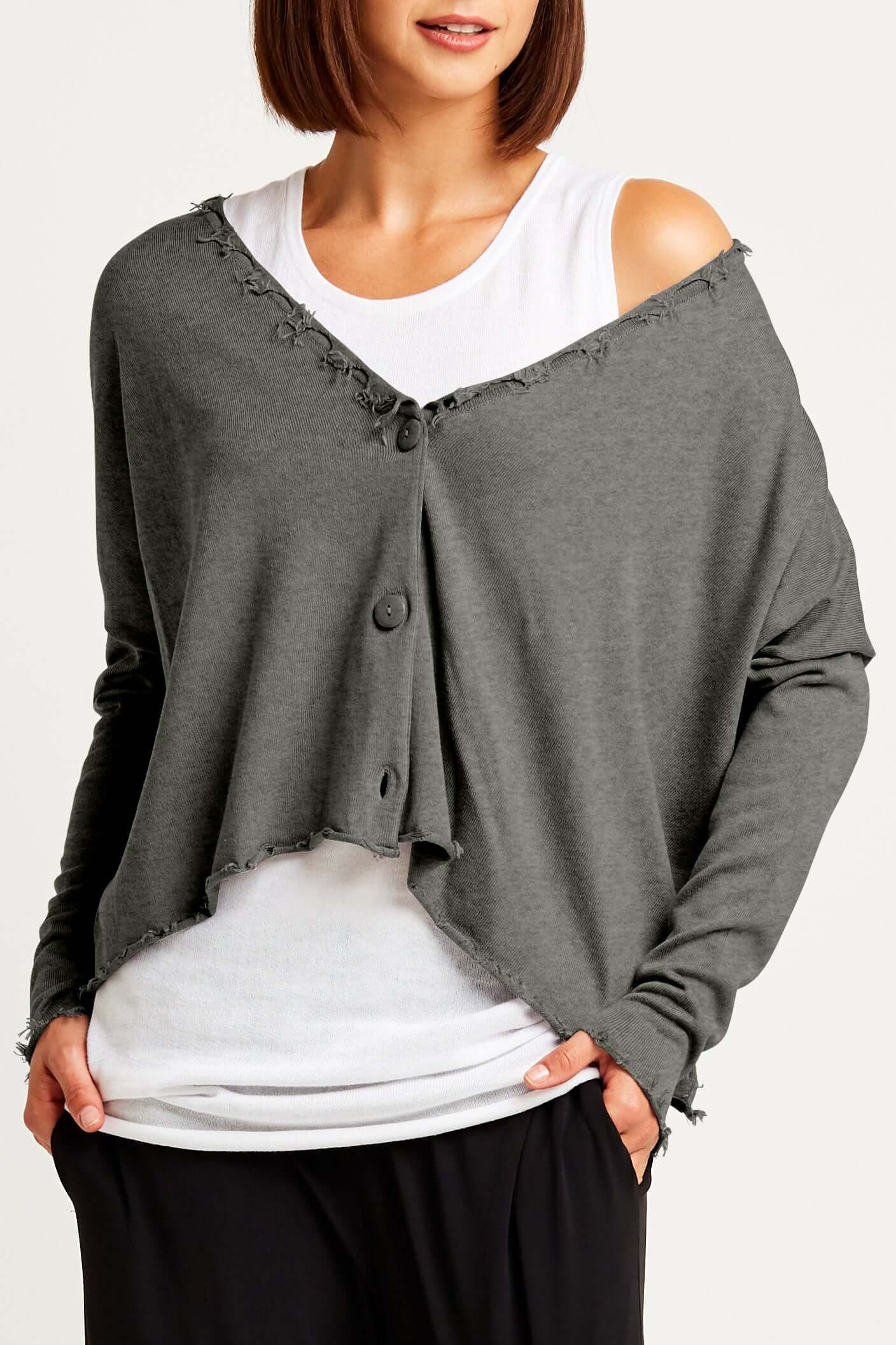 This ultra-hip lightweight cardigan redefines modern chic, showcasing distinctive distress and fray details along the edges. Its relaxed silhouette, marked by drop shoulders and a three-button closure, brings a fresh and bold perspective to your wardrobe, offering a stylish embrace with a rebellious twist.?