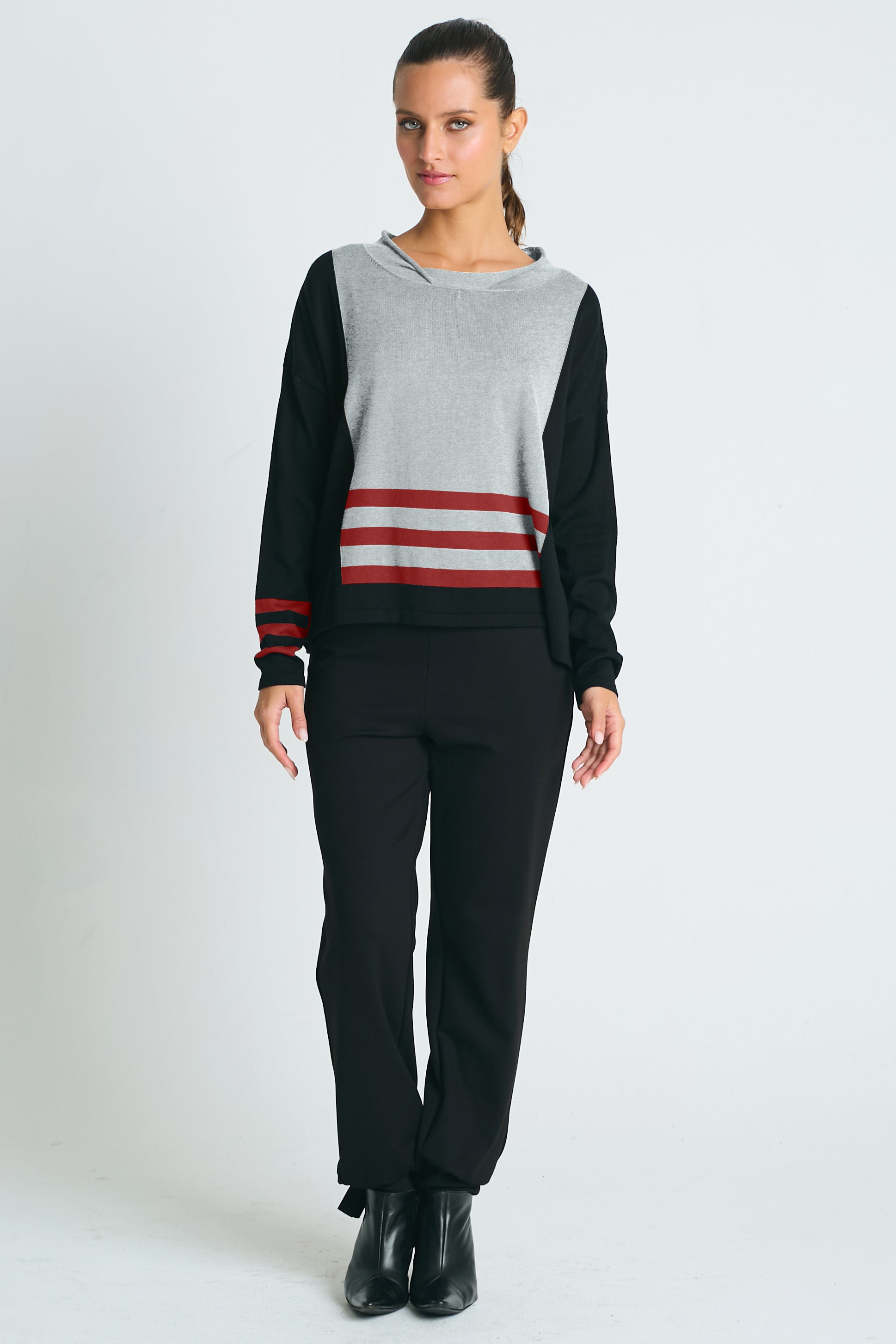 This statement crew blends sporty edge with soft structure in ultra-breathable Pima cotton. Featuring a bold color-blocked front with triple-stripe detailing and a relaxed mock collar, it balances graphic impact with everyday wearability. The fit is easy and the feel is pure comfort¡ªideal for layering, lounging, or lending a modern twist to your go-to black pant.