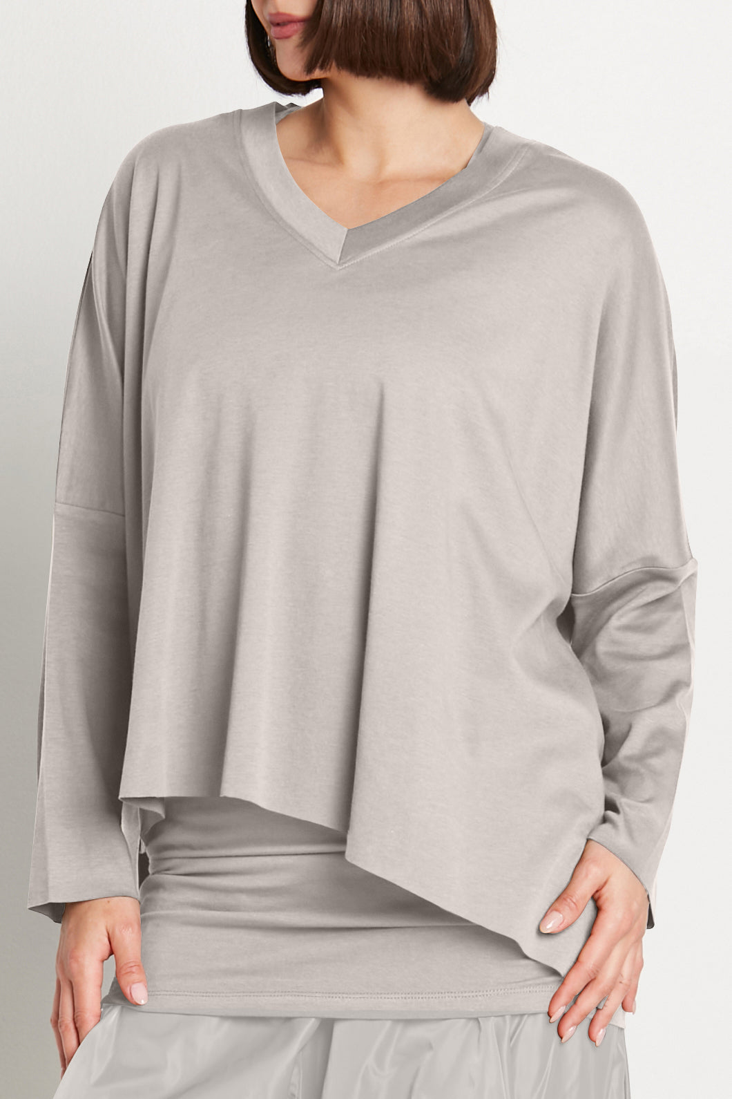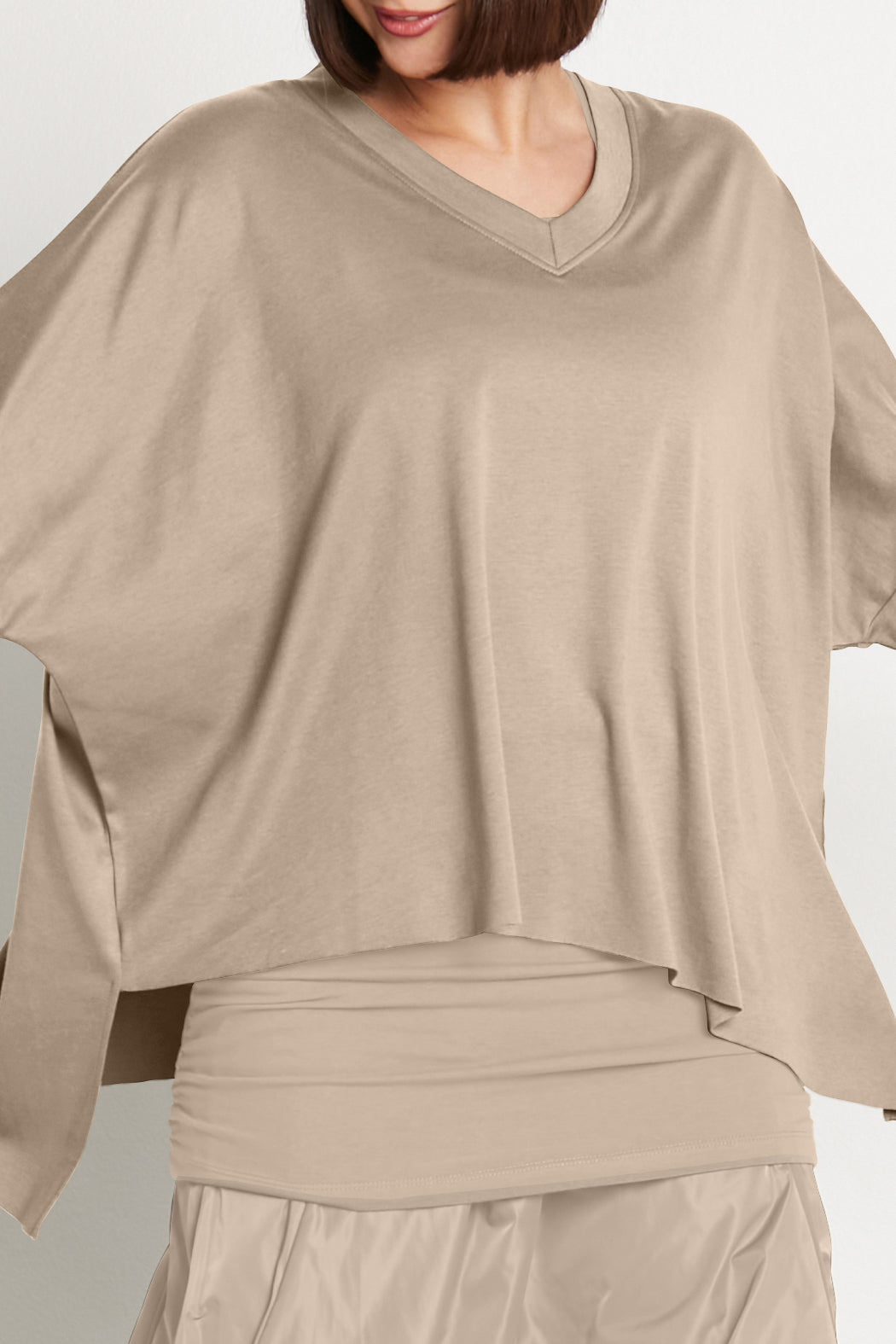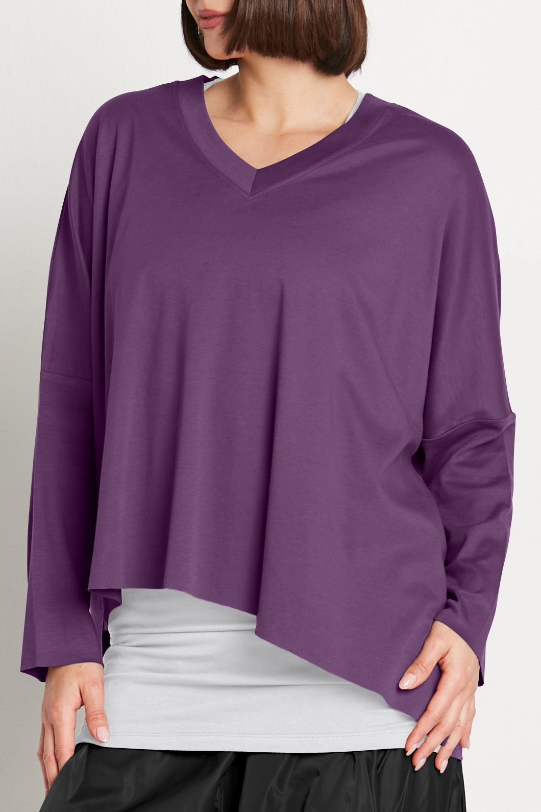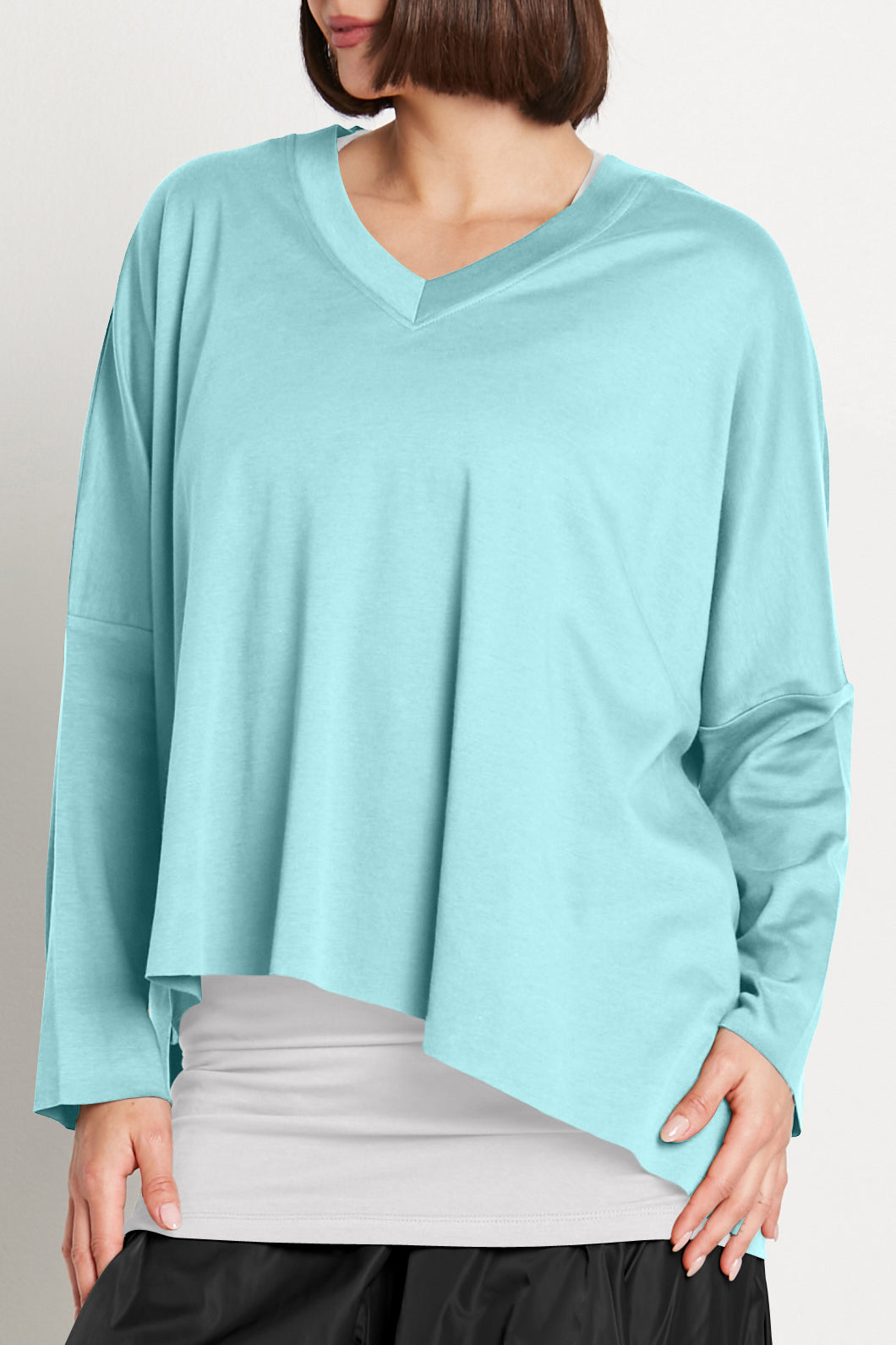 Experience the soft, breathable luxury of this V-neck tee, crafted from premium Pima cotton. Its relaxed fit and subtle asymmetrical hem offer a modern touch, while the fabric's smooth texture ensures comfort throughout the day. Perfect for layering or wearing solo, this tee effortlessly transitions from a casual brunch to a relaxed evening at home.?