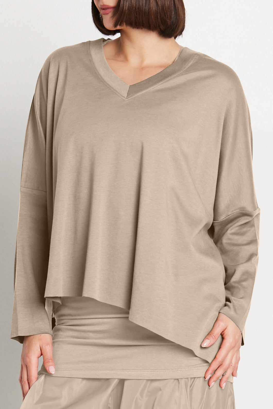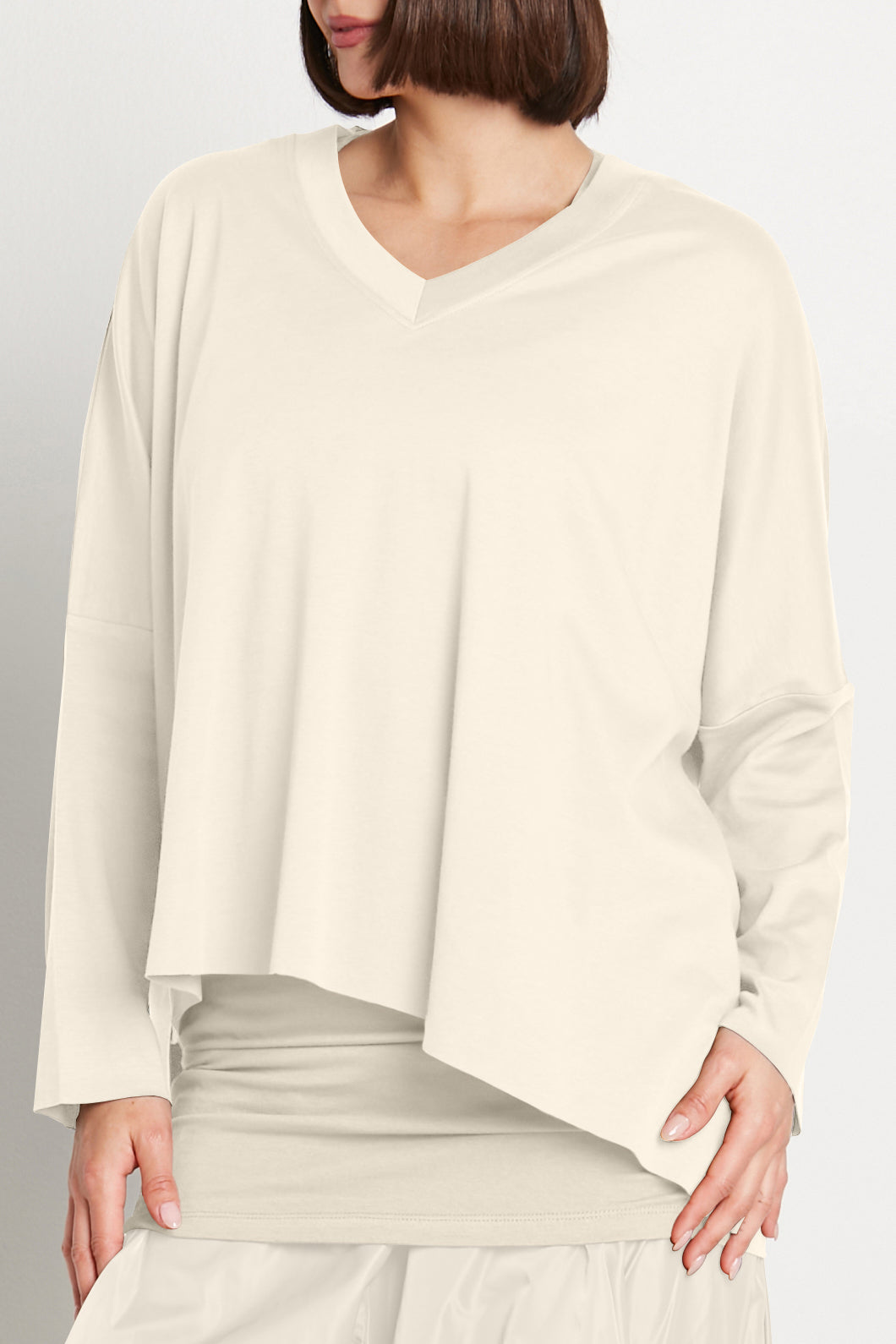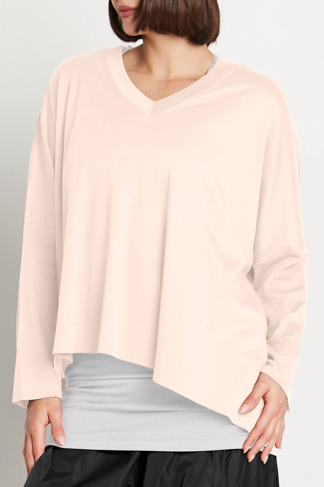 Experience the soft, breathable luxury of this V-neck tee, crafted from premium Pima cotton. Its relaxed fit and subtle asymmetrical hem offer a modern touch, while the fabric's smooth texture ensures comfort throughout the day. Perfect for layering or wearing solo, this tee effortlessly transitions from a casual brunch to a relaxed evening at home.?