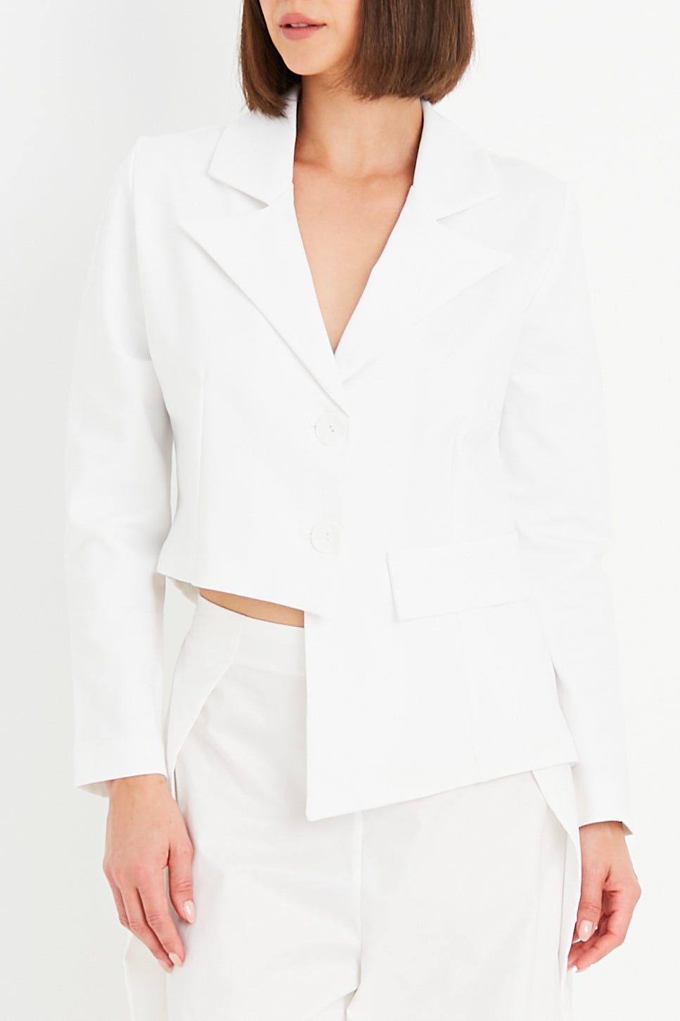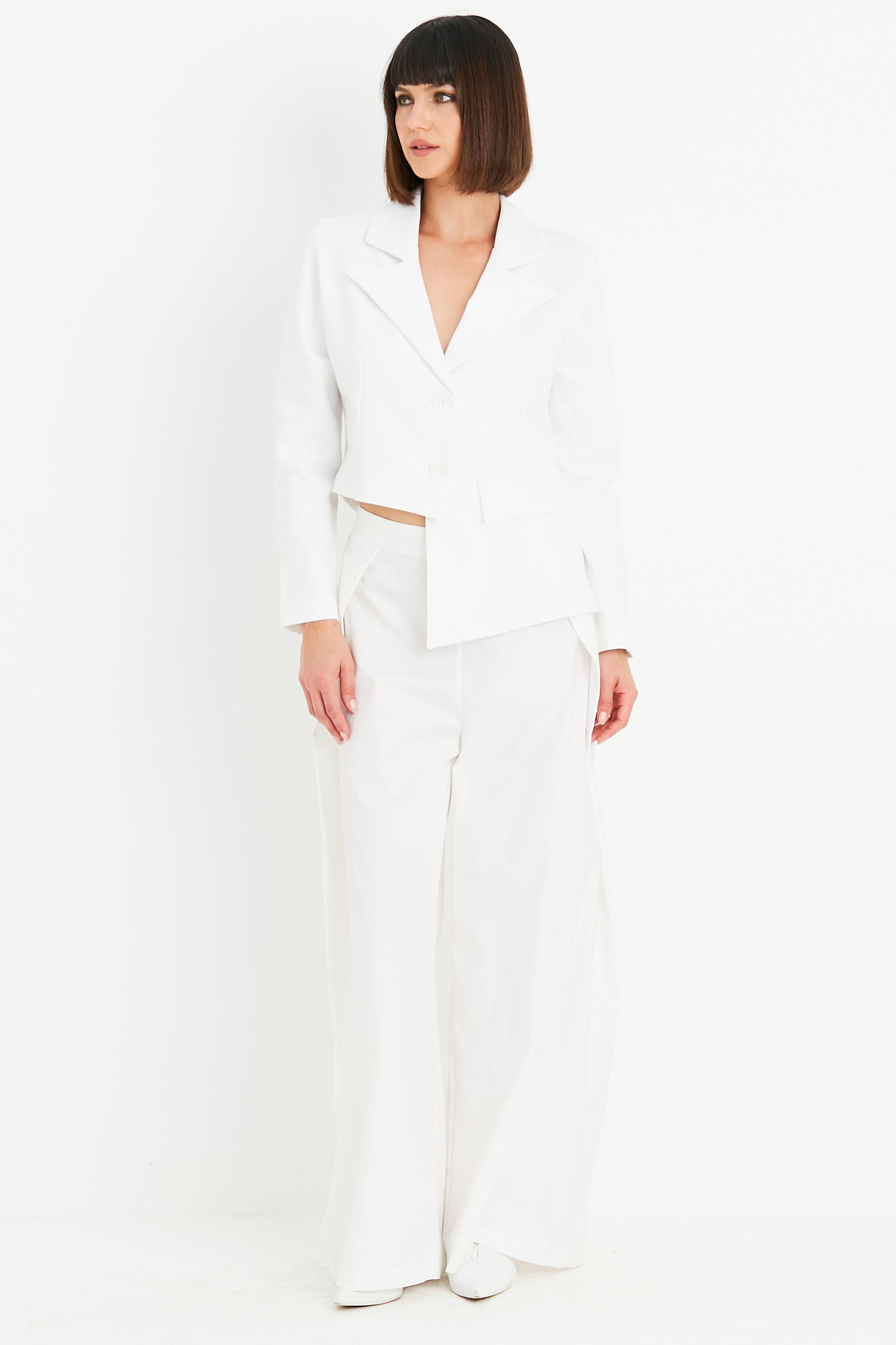 This cropped blazer redefines professional attire with a modern, asymmetrical twist. Its crisp lines and pristine hue offer a canvas for self-expression, while the scuba fabric ensures a flattering fit. This piece is a nod to those who appreciate classic style with an edge, perfect for transitioning from a strategic boardroom presence to an elegant evening affair.