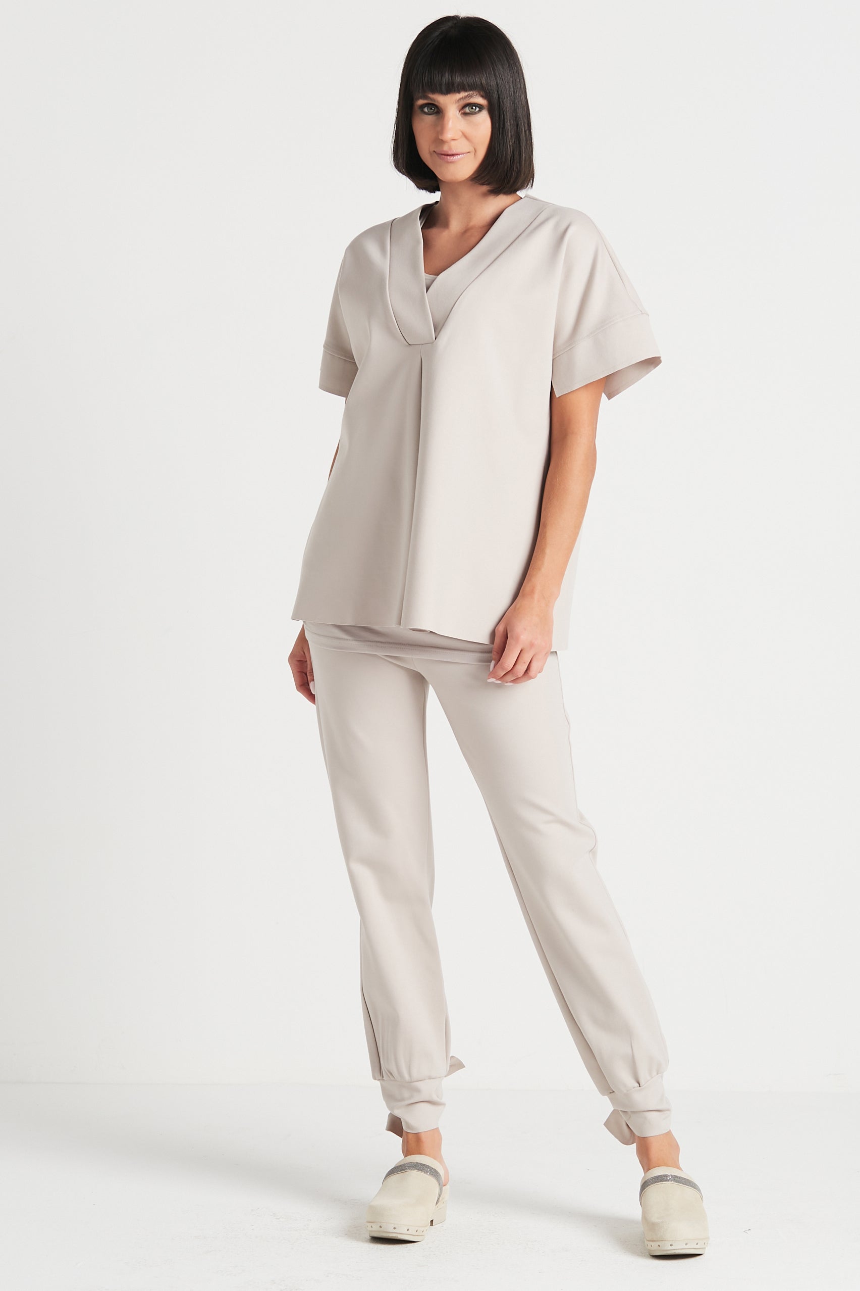 Classic, feminine neckline 'V' luxurious top is made from scuba.? Flatters from all angles', refined details are the core being of this top.? Features an inverted pleat on the front while the sleeves bare a touch of a slit on the very inside of the sleeve.? While it's so minimal, it's designed with comfort and style in mind!?