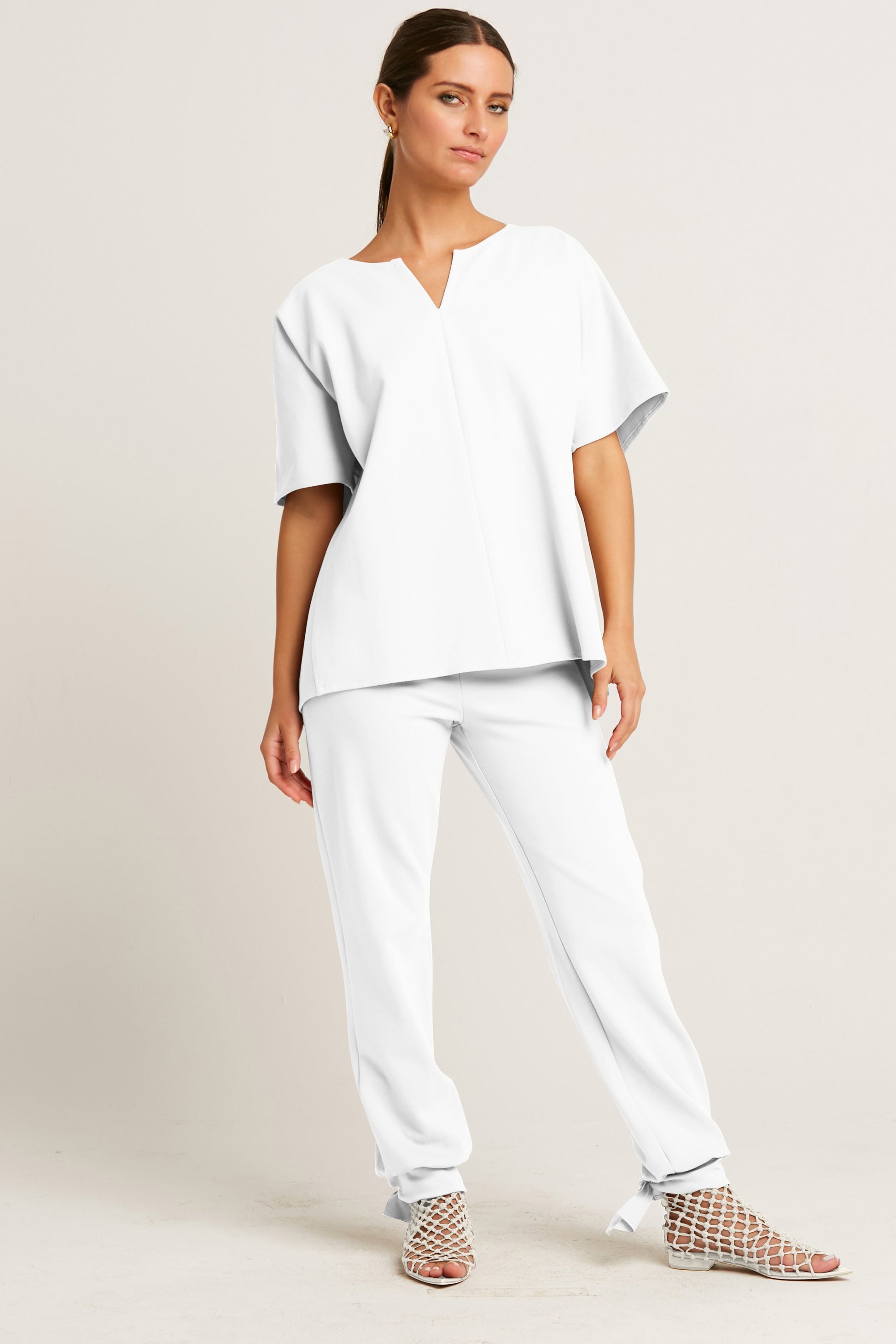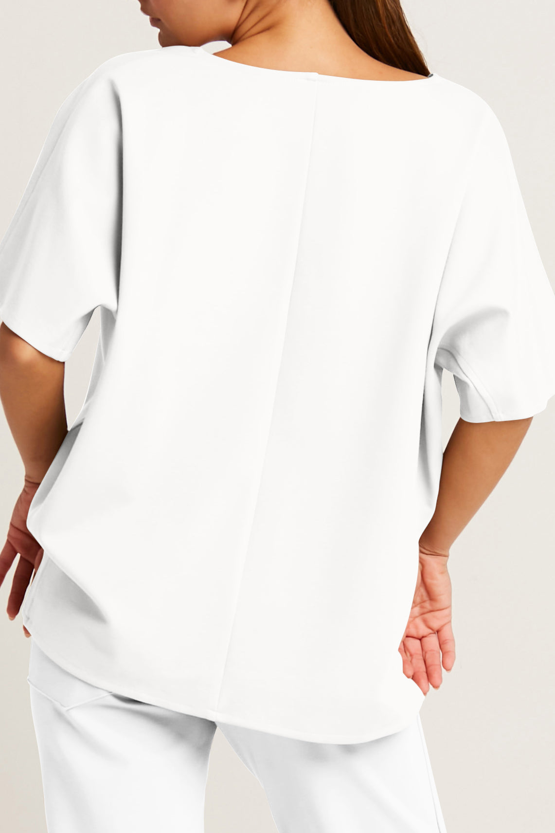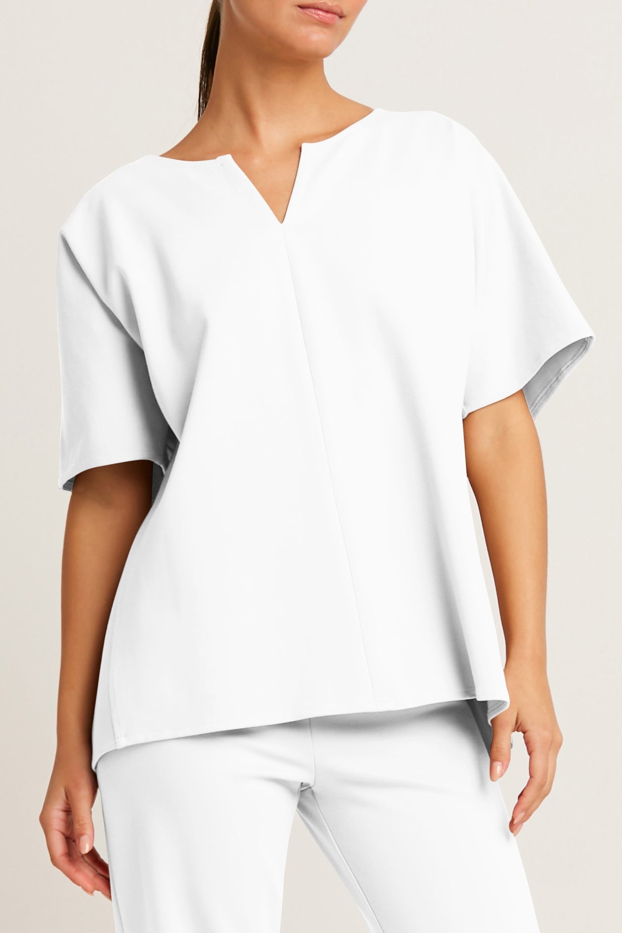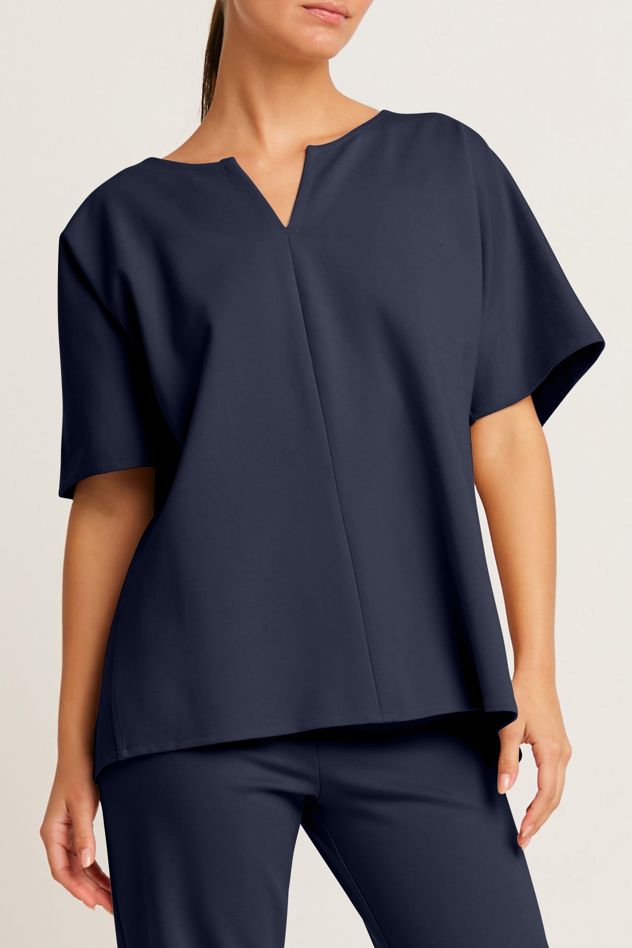 Crafted from our luxe scuba fabric, it offers a flattering drape and structured fit. The clean V-neckline exudes understated elegance, while its effortless silhouette makes it versatile for styling. Perfect for day-to-night transitions, this top provides a chic, polished look with maximum comfort.
