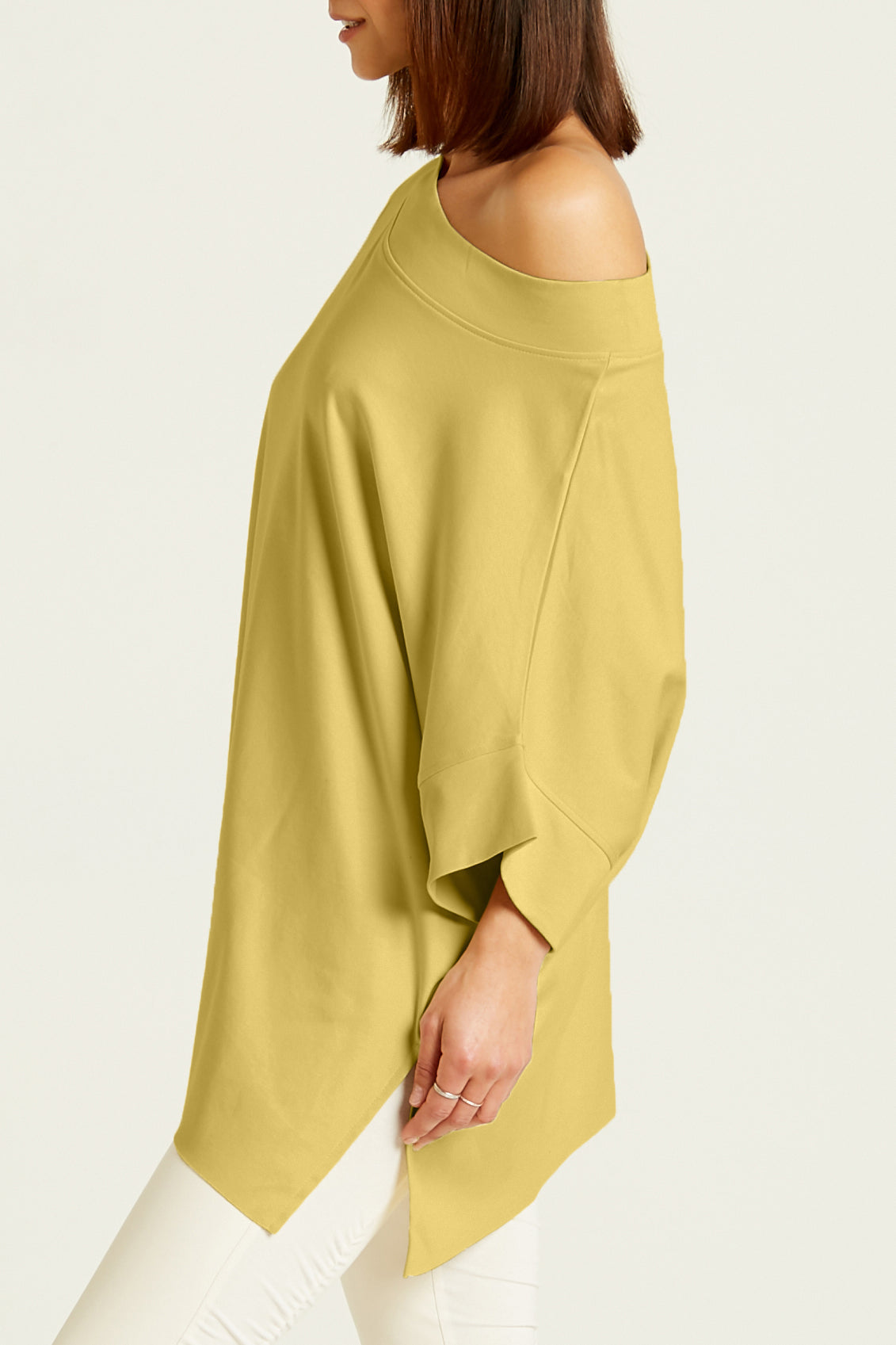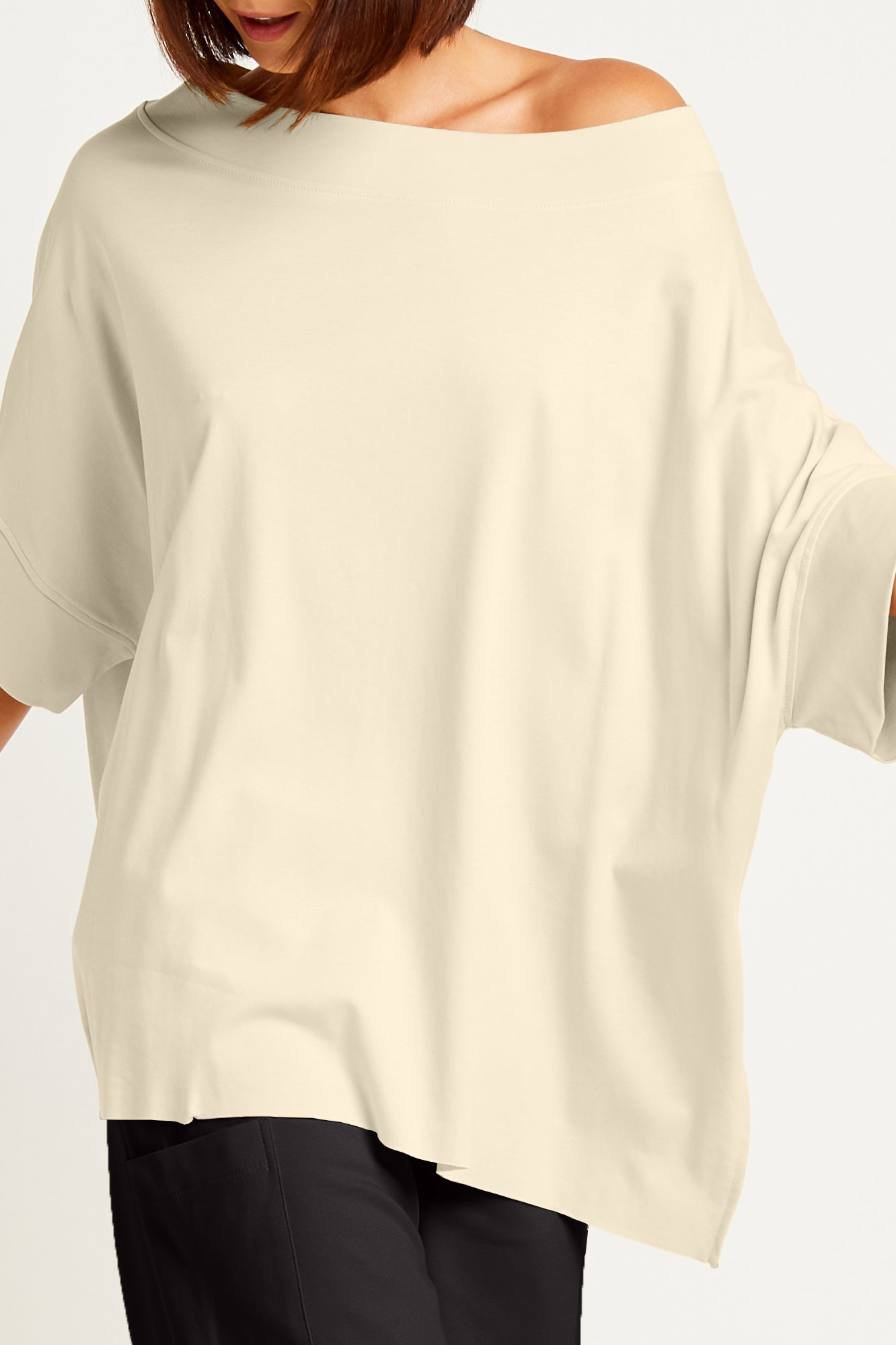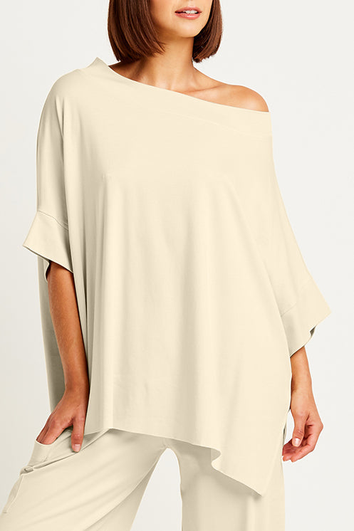 Designed for effortless elegance, this ultra-soft tee drapes beautifully with a fluid swing that flatters every silhouette. A refined ballet neckline adds a touch of grace, while the versatile cut allows you to style it on or off the shoulder. With wide, fashion-forward sleeves and an airy feel, this is the go-to piece for those who crave relaxed sophistication.