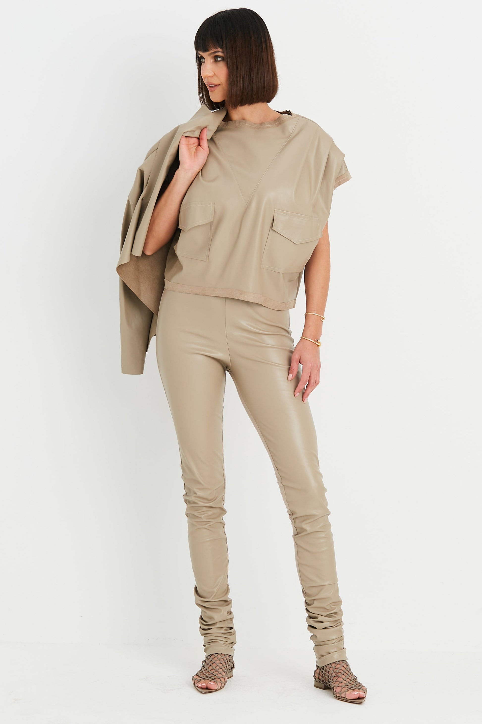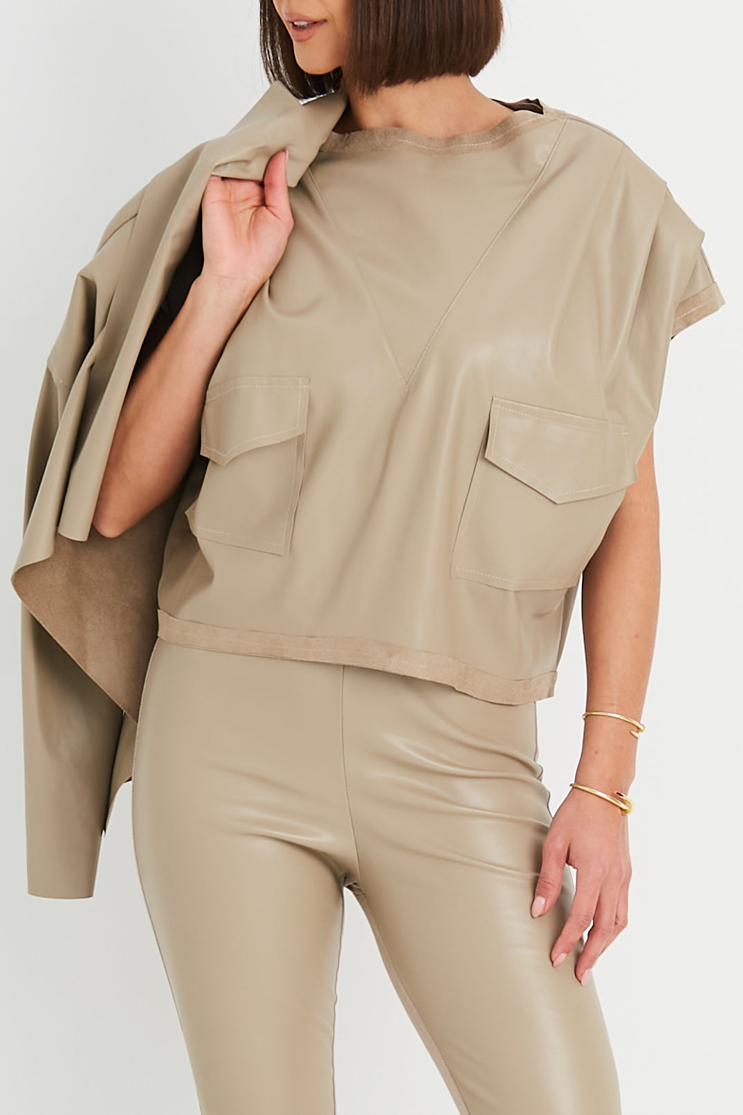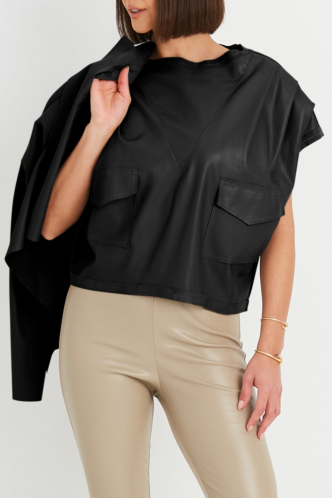 Discover the modern edge with our Vegan Leather "Eisenhower" Pullover Top, designed for the chic woman who dares to stand out. With its crisp structure and soft, ethical leather, it offers an urban twist to the classic pullover. The strategic silhouette with utilitarian pockets marries functionality with high fashion, while the ease of its care ensures it's not just a statement, but a staple.?