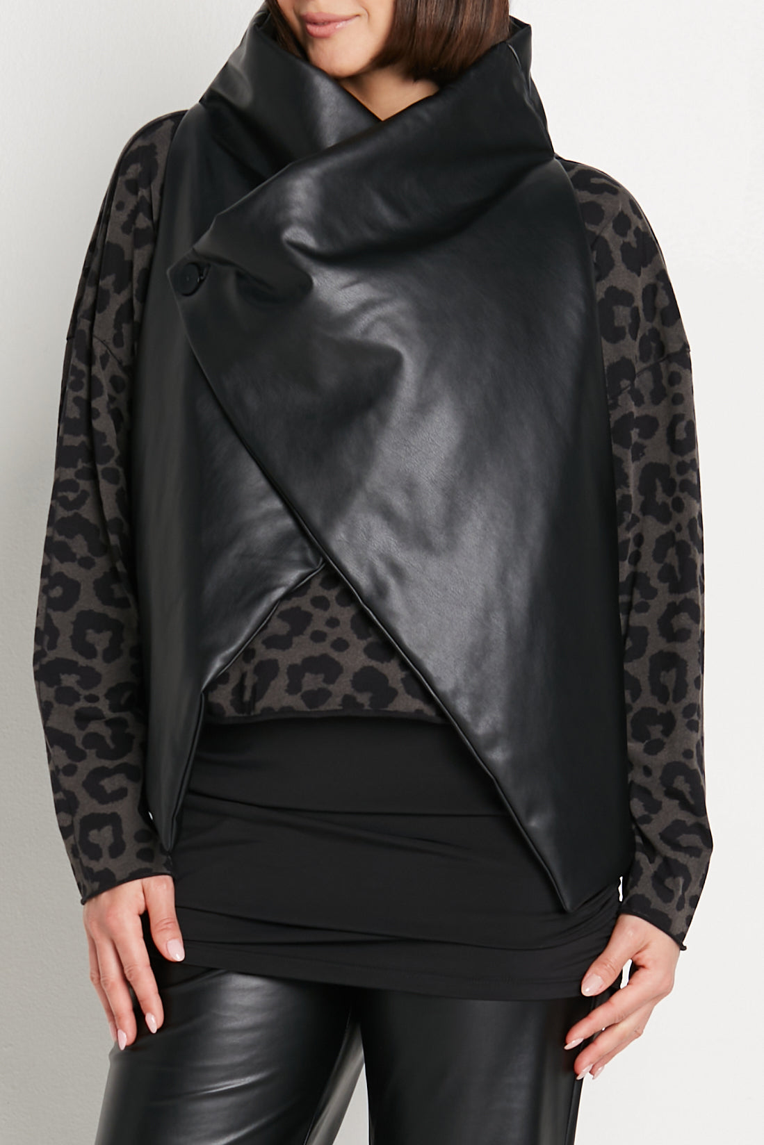 The vest features a padded design, providing extra warmth and a structured silhouette that flatters the body. The high collar adds a sophisticated touch, while the open front allows for effortless styling with your favorite tops and sweaters. Pair it with bold prints, as shown, or keep it classic with monochrome layers for a refined, modern look.